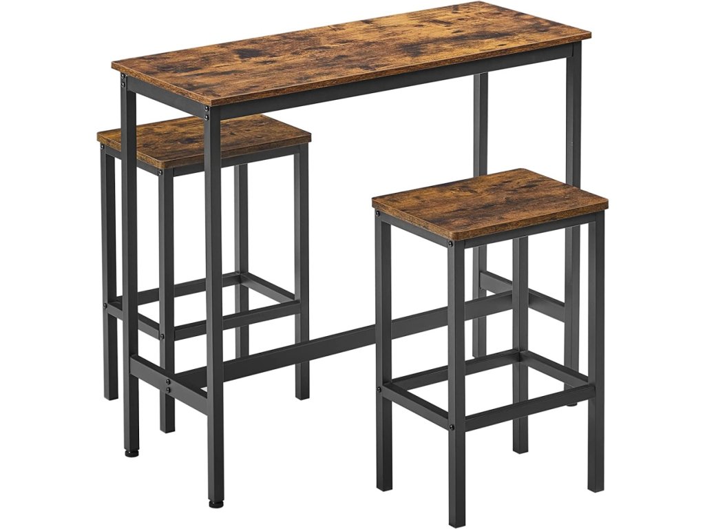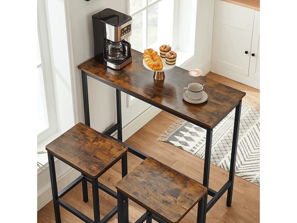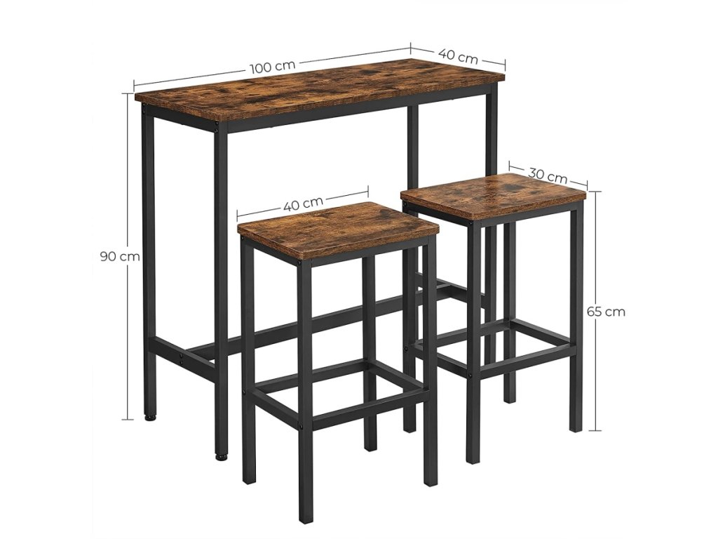 Stůl vybaven odkladací deskou o velikosti 100 x 40 cm. Rozměr stoličky 30 x 40 x 65 cm. Tato sada barových stolků má jednoduchou konstrukci. Sada 1 jídelního stolu a 2 stoliček, podrobný montážní návod s montážním příslušenstvím. Rozměry produktu: 40 x 100 x 90 cm, vaha 20, 2 kg. Materiál: Dřevěná dřevotříska, ocel.