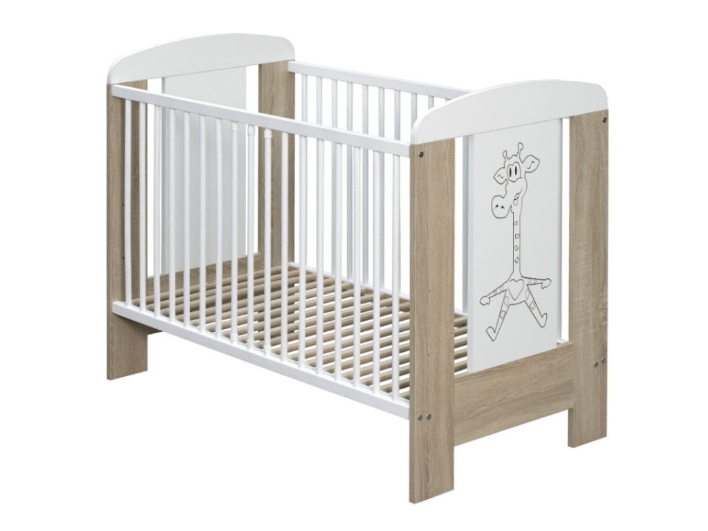 Dětská postýlka KAMIL 120 × 60 cm – dub sonoma / bílá, žirafa Dřevěná postýlka pro miminko 120 × 60 cm – dub sonoma / bílá
