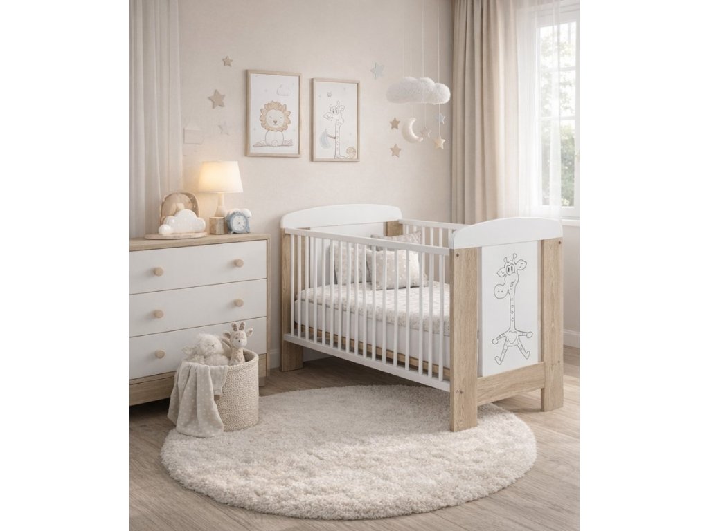 Čelo postýlky zdobí roztomilý obrázek žirafy, který dodává nábytku hravý dětský charakter a krásně doplní interiér dětského pokoje. Díky neutrální barevné kombinaci se postýlka snadno kombinuje s ostatním nábytkem a dekoracemi.