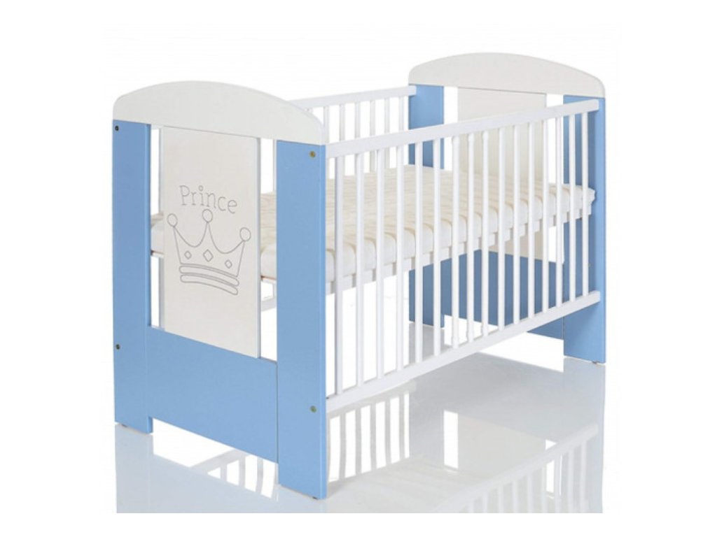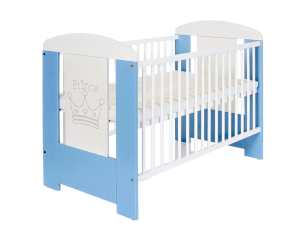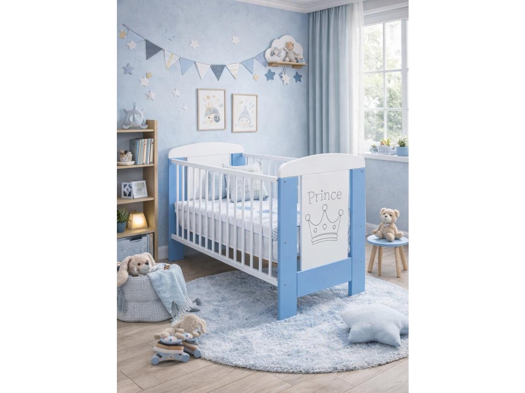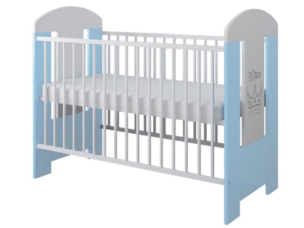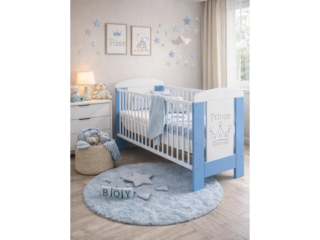 Čelo postýlky zdobí motiv korunky s nápisem Prince, který dodává postýlce jemný a hravý vzhled. Kombinace bílé a modré barvy se skvěle hodí do chlapeckého pokojíčku a snadno se kombinuje s ostatním nábytkem.