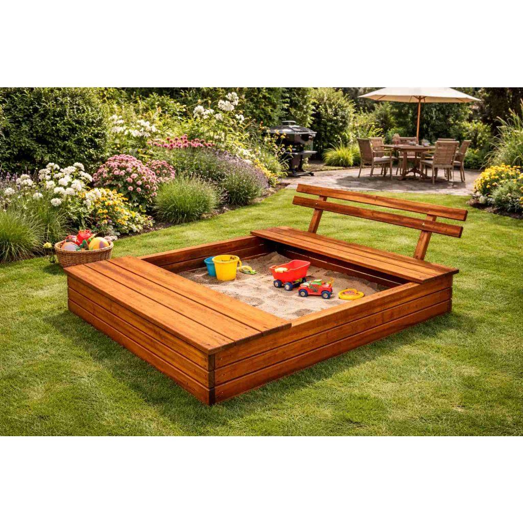 Součástí pískoviště jsou integrované lavičky, které dětem poskytují pohodlné sezení při hře nebo odpočinku. Konstrukce je vyrobena z kvalitního dřeva, které zajišťuje pevnost, stabilitu a dlouhou životnost i při venkovním použití.