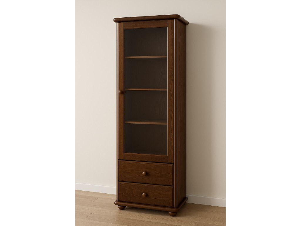 Elegantní dřevěná vitrína z masivní borovice v odstínu ořech se skleněnými dvířky a dvěma spodními zásuvkami. Ideální pro vystavení knih, porcelánu či dekorací. Kvalitní řemeslné zpracování a přírodní materiál dodají interiéru teplo a styl. Nadčasový kus nábytku vhodný do obývacího pokoje, jídelny či pracovny.