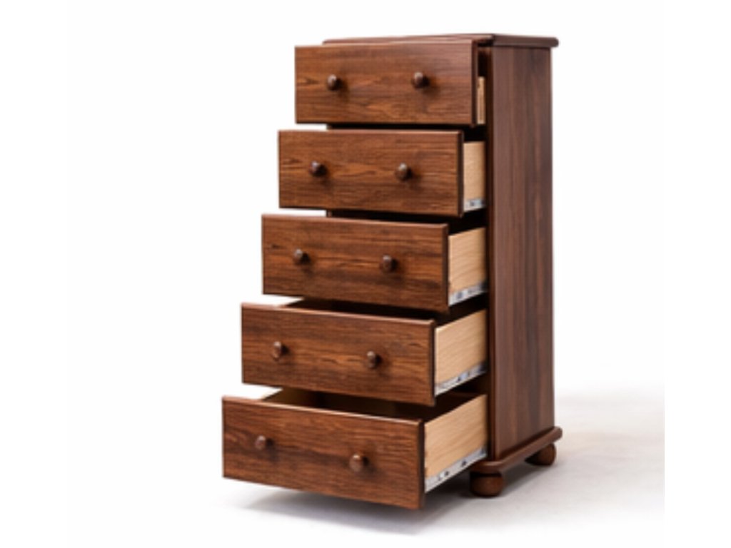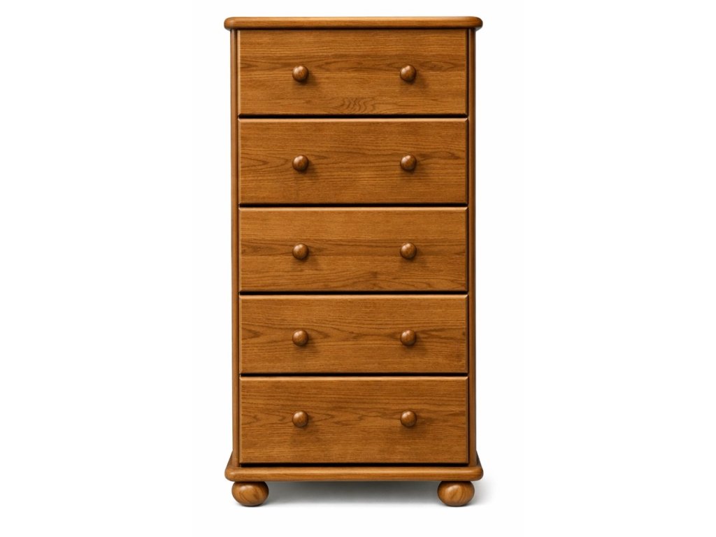 Úzká, ale velmi praktická dřevěná komoda KD115 z masivního borovicového dřeva je ideálním řešením pro menší interiéry, kde je potřeba šetřit prostorem, ale ne na úložném prostoru. Komoda disponuje pěti hlubokými zásuvkami, do kterých snadno uložíte prádlo, oblečení i doplňky. Zásuvky jsou vyrobeny z kombinace masivního dřeva, DTD a sololitové desky, což zajišťuje jejich pevnost a dlouhou životnost. Zadní stěna komody je uzavřena sololitovou deskou, která dodává nábytku stabilitu. Celkový dojem podtrhují elegantní kulaté nožky, které zároveň umožňují snadné čištění pod komodou. Povrchová úprava bezbarvým vodou ředitelným lakem zvýrazňuje přirozenou kresbu borovice a zároveň chrání dřevo. Komoda je dostupná v přírodní borovici za základní cenu, nebo v dalších odstínech dle výběru – cena se liší podle zvoleného moření (viz objednávkový formulář).