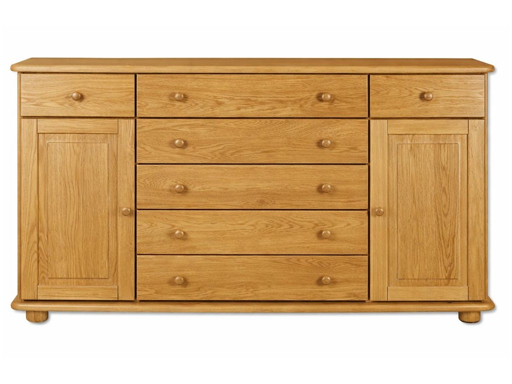 Elegantní a praktická komoda z masivního borového dřeva je skvělým doplňkem do každé domácnosti. Nabízí dostatek úložného prostoru díky kombinaci pěti prostorných zásuvek, dvou menších horních šuplíků a dvou skříněk s plnými dvířky. Díky šířce 165 cm poskytuje komoda maximální využití úložného prostoru bez kompromisů na estetice. Přírodní vzhled borovicového dřeva je zvýrazněn bezbarvým vodou ředitelným lakem, který zároveň chrání povrch. Konstrukce je stabilní a pevná, zadní stěna je uzavřená sololitovou deskou, stejně jako vnitřní části zásuvek jsou z kombinace masivu, DTD a sololitu. Klasický vzhled podtrhují kulaté nožičky, které zajišťují stabilitu a elegantní profil.