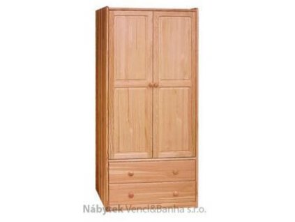 Dřevěná dvoudveřová šatní skříň z masivu borovice se dvěma zásuvkami. Elegantní a praktický kus nábytku s přírodním vzhledem.