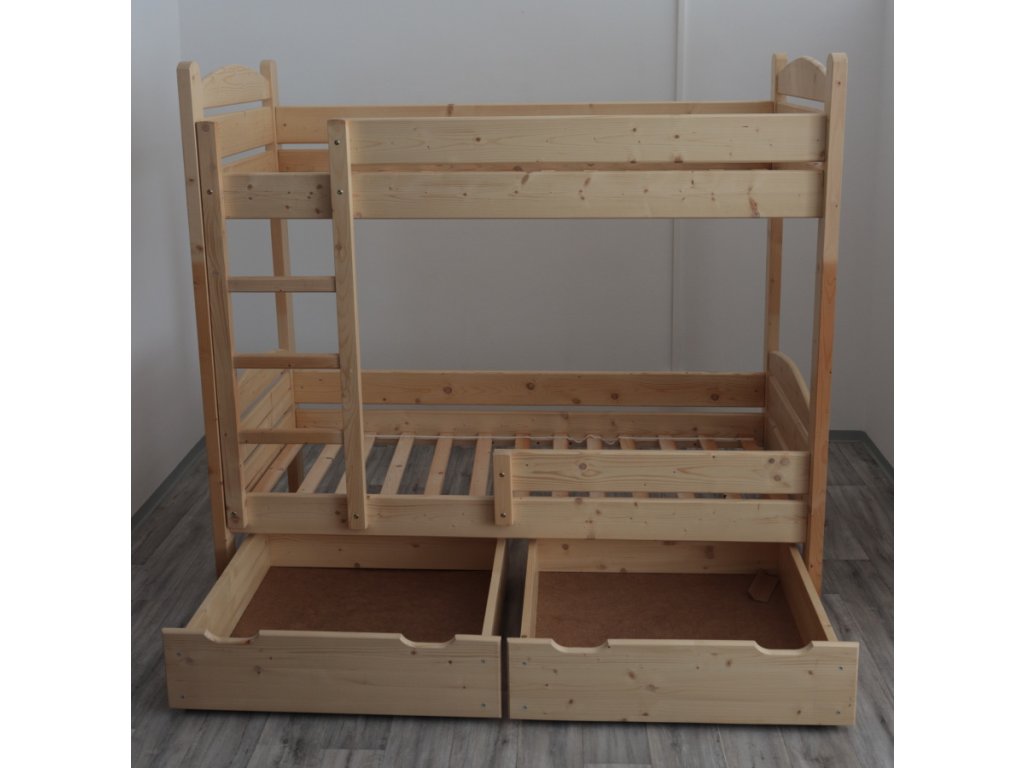 Patrová postel Jarek z masivního smrkového dřeva s praktickými šuplíky (není zahrnuto v ceně) a žebříkem. Stabilní konstrukce ideální do dětských pokojů.