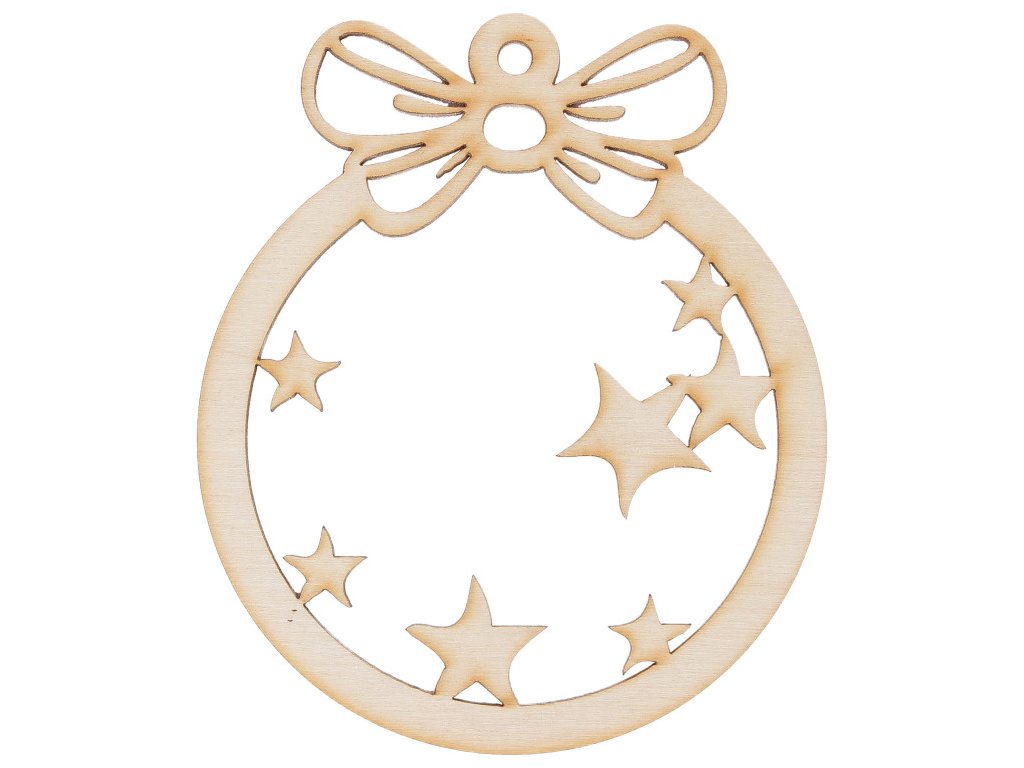 Tato dřevěná vánoční ozdoba ve tvaru kulaté baňky s mašlí a hvězdami vnese do vaší vánoční výzdoby jemnou přírodní eleganci. Precizně vyřezávaný motiv hvězd dodává ozdobě lehkost a vzdušnost, díky čemuž krásně vynikne na vánočním stromečku, větvičkách nebo v okně.