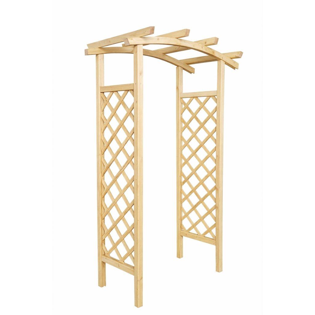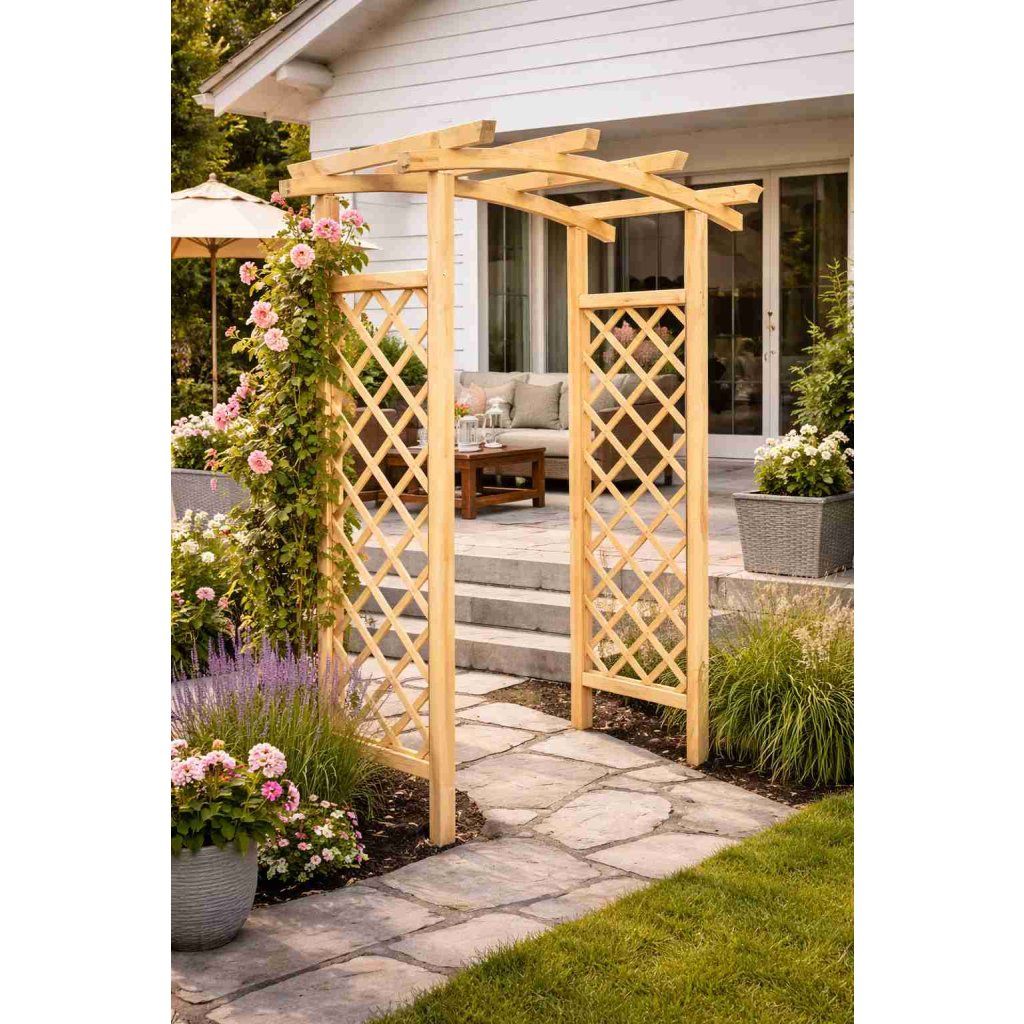 Boční mřížky slouží jako ideální opora pro popínavé rostliny, jako jsou růže, břečťan nebo vinná réva. Horní oblouková konstrukce dodává pergole elegantní vzhled a vytváří příjemný průchod nebo zahradní dominantu.