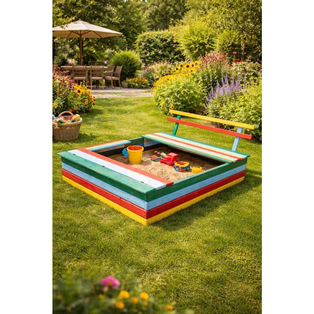 Dřevěné dětské pískoviště s víkem 150×110 cm – barevné uzavíratelné | zahradní pískoviště | s lavičkami