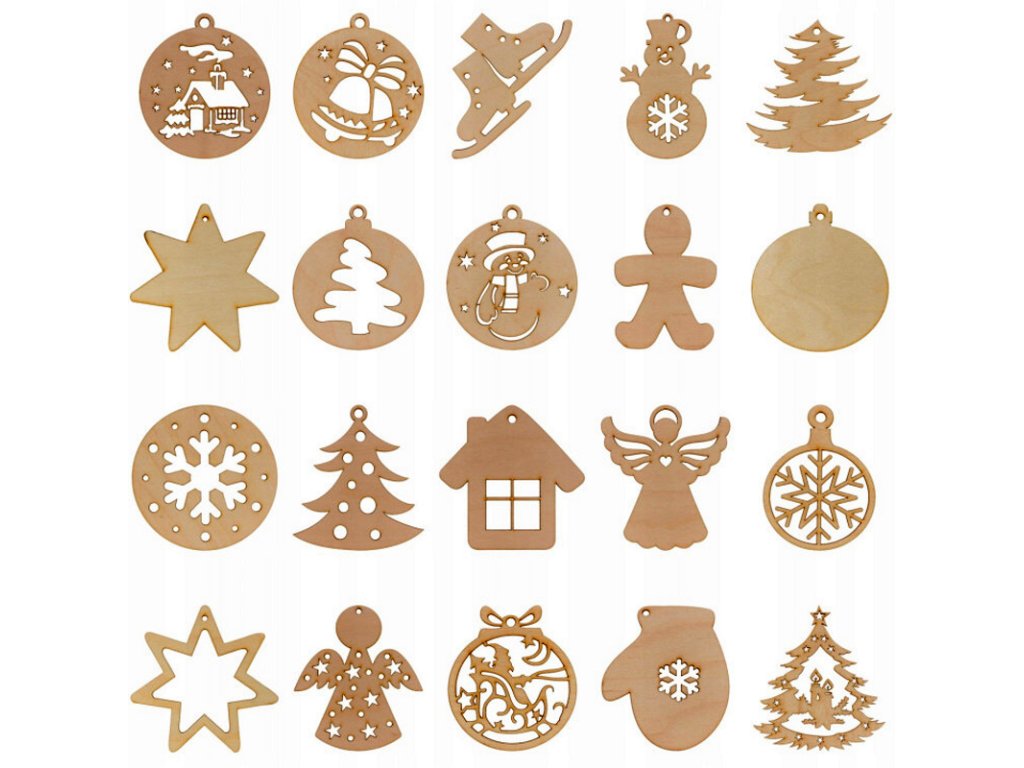 Dřevěné vánoční ozdoby – sada 20 ks hvězdy, koule, stromečky a andílci