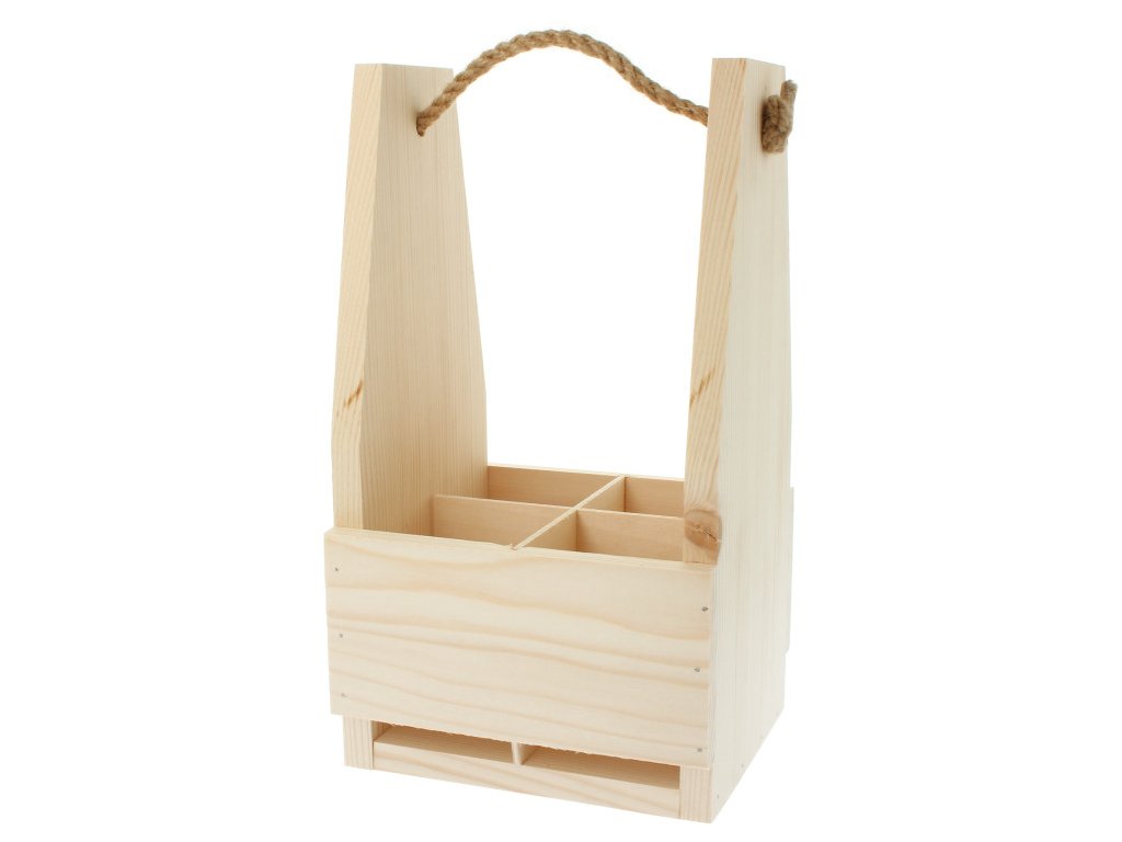 Dřevěný nosič piva s 6 přihrádkami je praktickým a stylovým řešením pro přenášení lahví piva, limonády nebo jiných nápojů. Je vyroben z kvalitního přírodního dřeva a doplněn pevným lanovým madlem, které zajišťuje pohodlné a bezpečné nošení.