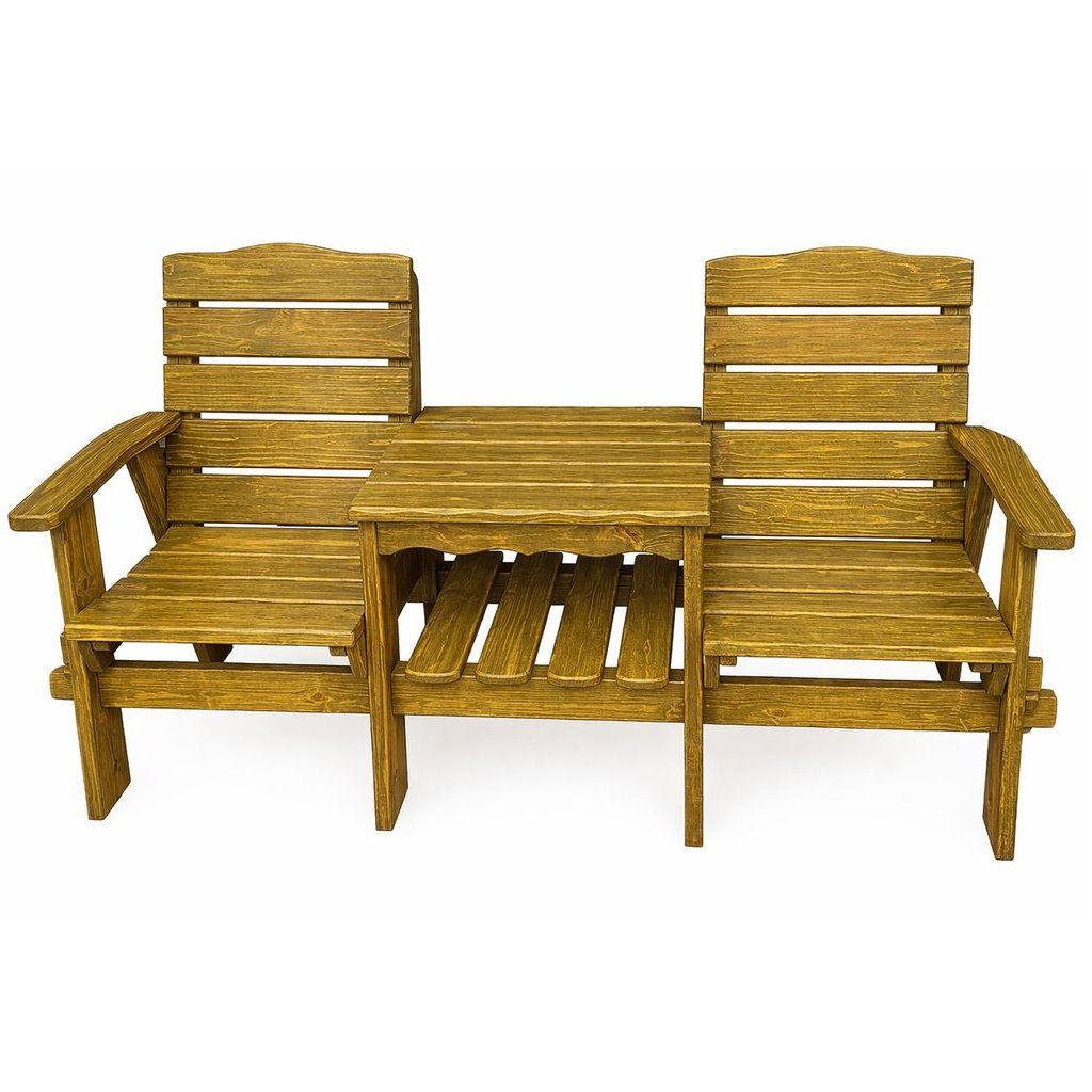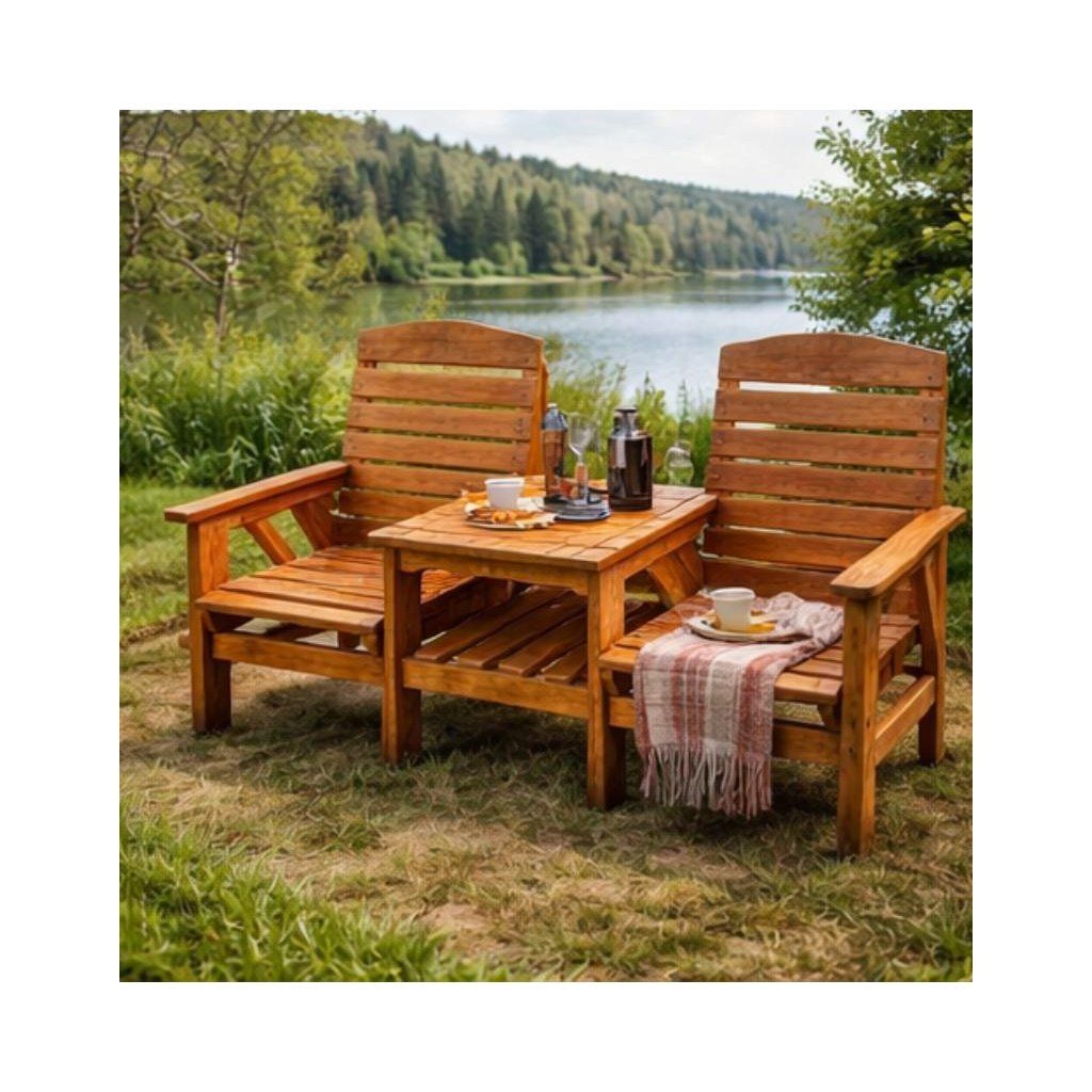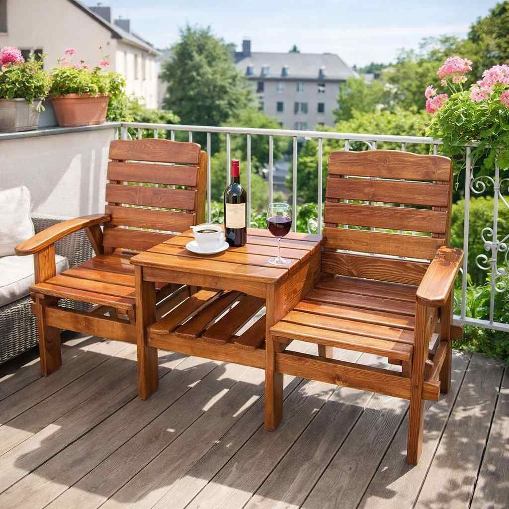 Tento dřevěný balkonový nábytkový set je ideální pro vaše venkovní posezení. Sestava zahrnuje jeden stůl a dvě křesla, vše vyrobené z masivní borovice a vzájemně propojené pro vyšší stabilitu.