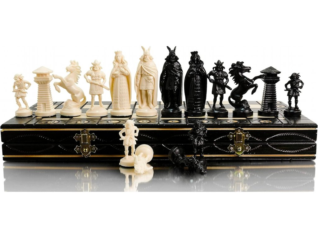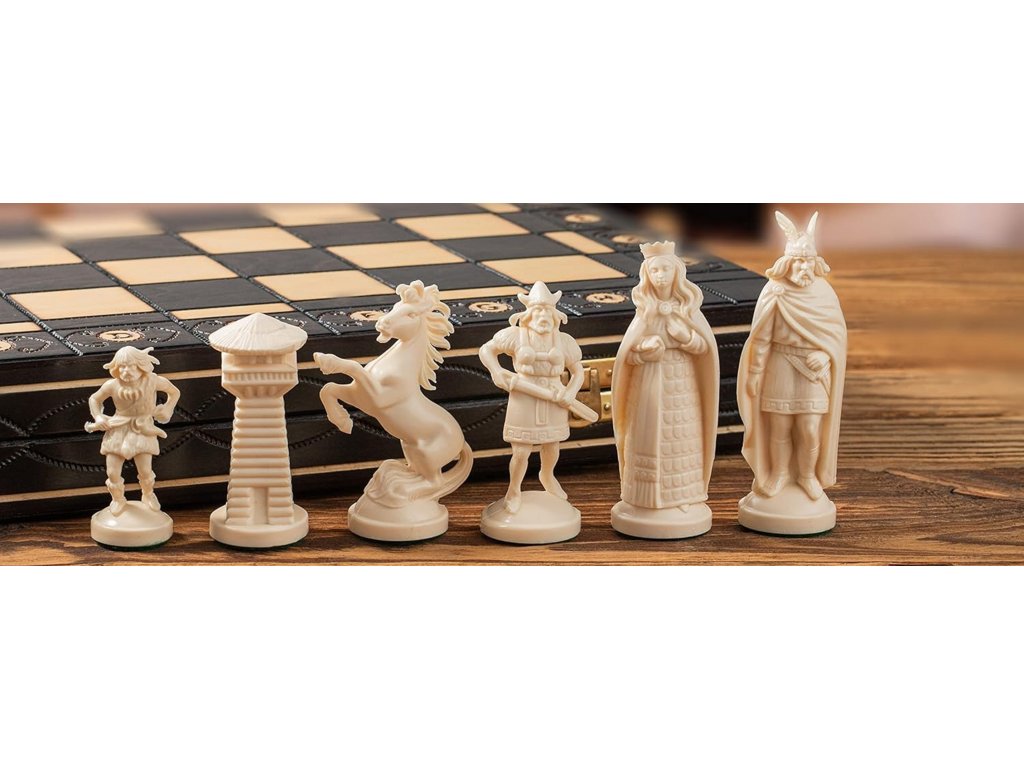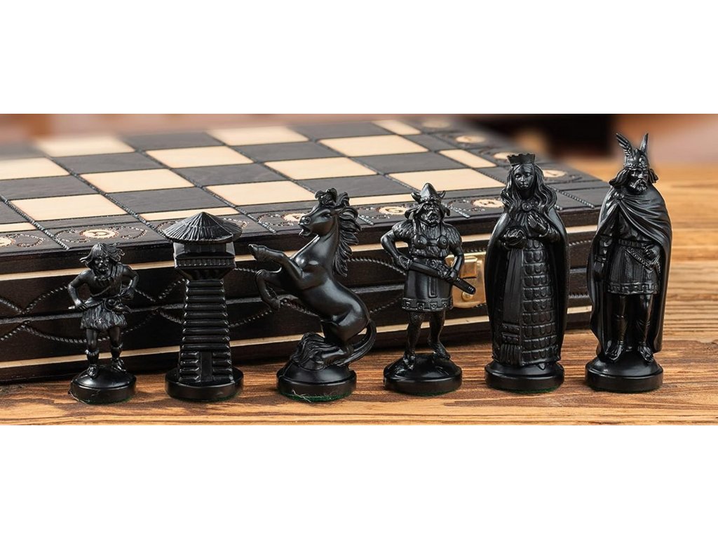 Exkluzivní šachový set Wiking v černo-bílé kombinaci zaujme na první pohled svým propracovaným vikingským designem a kvalitním zpracováním. Velká šachovnice o rozměru 42 x 42 cm působí reprezentativně a je ideální nejen pro pohodlnou hru, ale také jako stylová dekorace do interiéru.