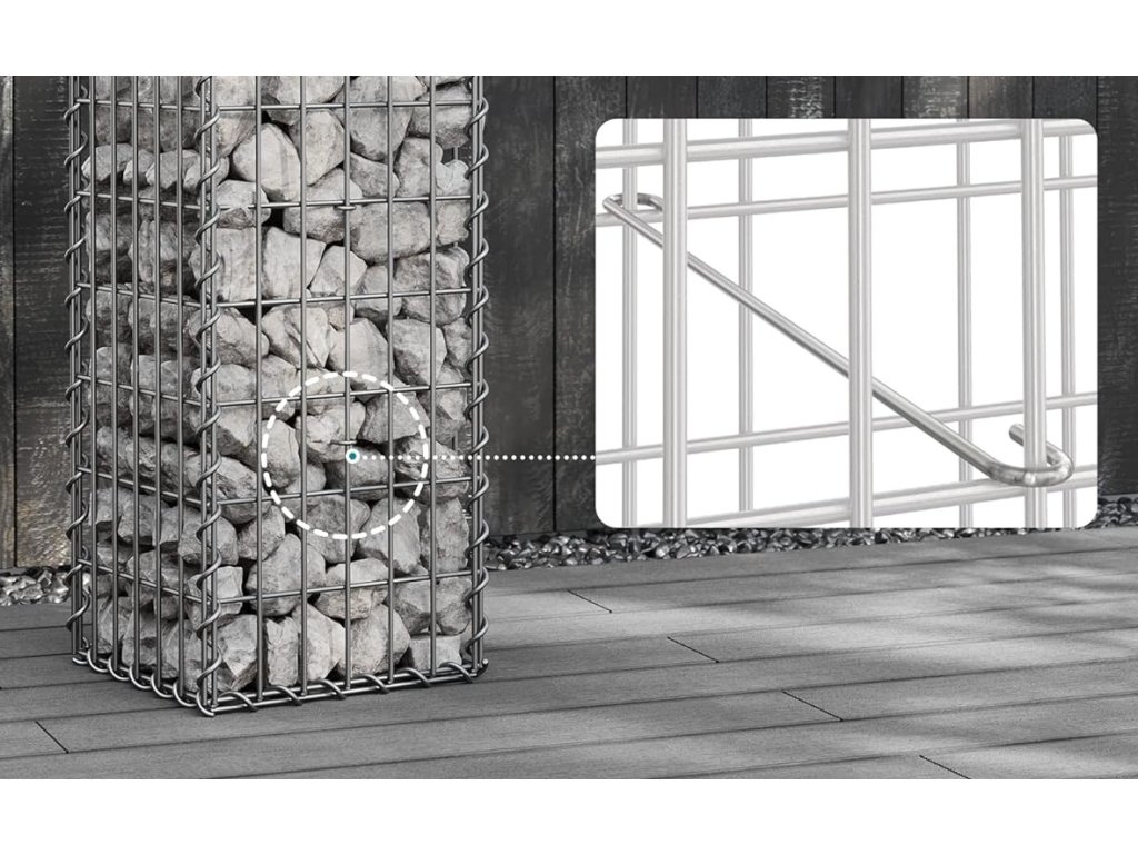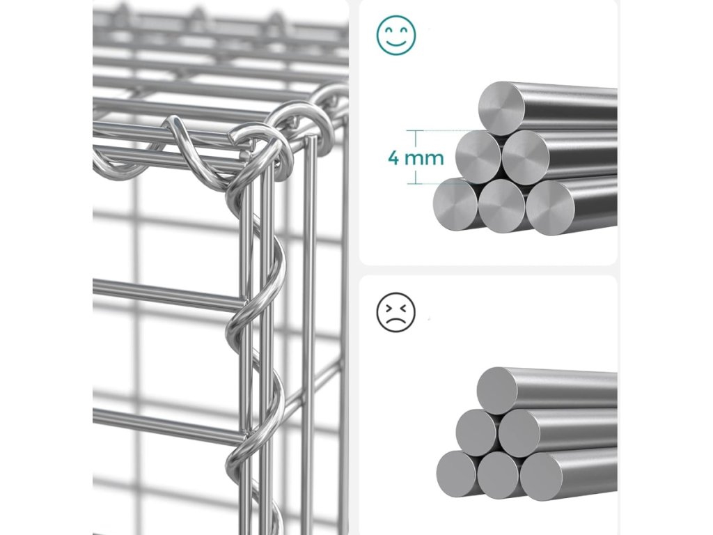 Klec je vyrobena z odolného ocelového drátu, který zajišťuje vysokou stabilitu a dlouhou životnost i při venkovním použití. Konstrukce je navržena tak, aby bez problémů odolala tlaku kameniva a povětrnostním vlivům.