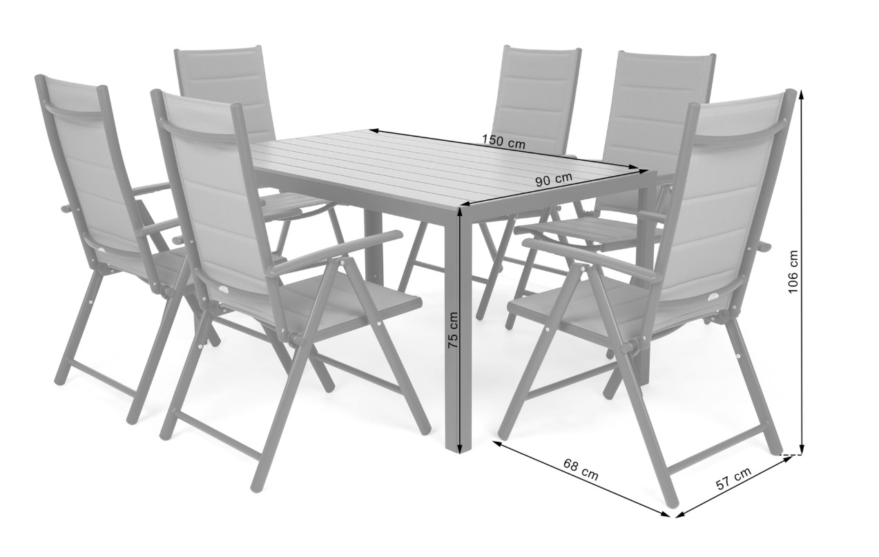 Součástí sestavy je šest skládacích židlí s měkkým polstrovaným potahem. Opěradlo lze nastavit do 7 poloh, takže si každý snadno zvolí ideální pozici pro stolování nebo odpočinek. Židle lze po sezóně jednoduše složit a uskladnit.