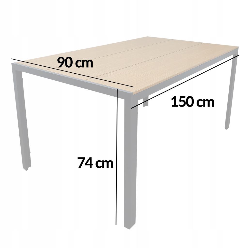 Prostorná obdélníková deska o rozměru 150 × 90 cm poskytuje dostatek místa pro rodinné stolování, posezení s přáteli i každodenní využití na terase nebo zahradě.