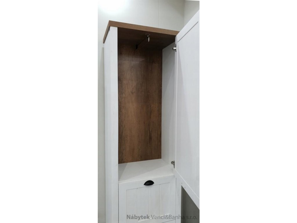 - Horní část skříně disponuje prostorným ramínkovým oddílem uzavřeným plnými dvířky.