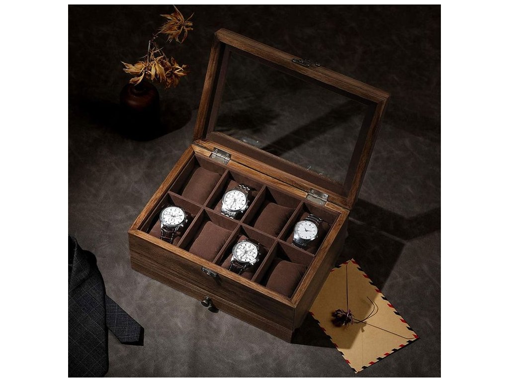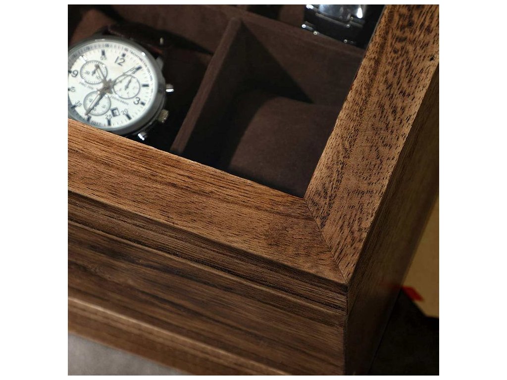 Horní víko je vybaveno průhledným sklem, které umožňuje mít hodinky stále na očích a zároveň je chrání před prachem. Vnitřní prostor je rozdělen na samostatné přihrádky se sametovou podšívkou, která chrání hodinky před poškrábáním.
