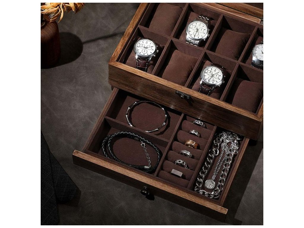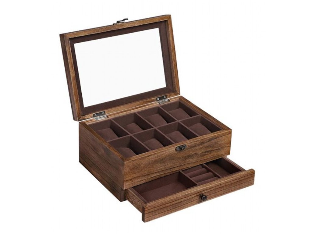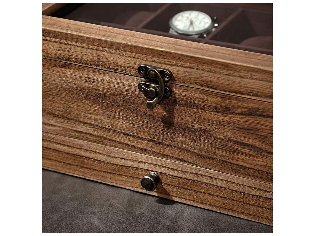 Součástí krabičky je také praktická výsuvná zásuvka, vhodná pro uložení šperků, řemínků, manžetových knoflíčků nebo drobných doplňků. Pevná konstrukce a kvalitní zpracování zaručují dlouhou životnost.