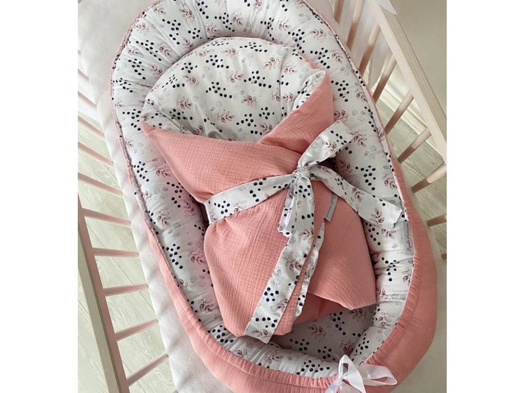 Lehký letní startovací set pro miminko z certifikovaných antialergenních materiálů, obsahující hnízdečko, péřovou zavinovačku a mušelínovou dečku pro maximální komfort od narození.