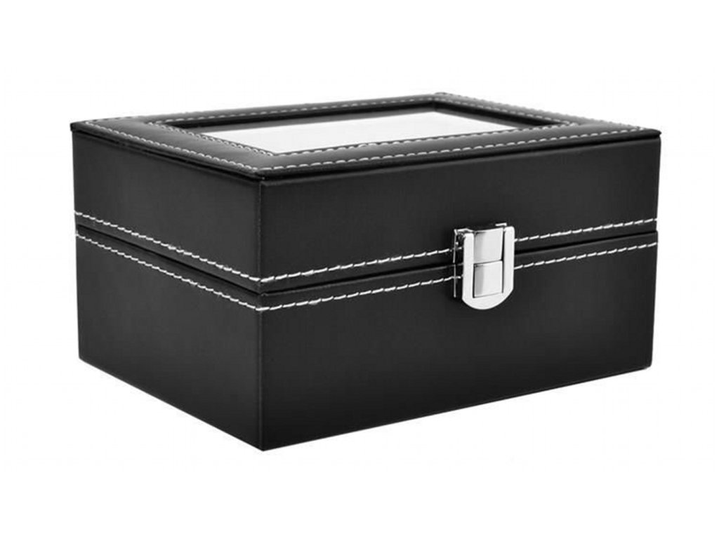 Vnější část je potažena černým elegantním materiálem s dekorativním prošíváním, vnitřek je vystlán jemným světlým polstrováním, které dodává luxusní vzhled a zároveň chrání hodinky. Průhledné víko umožňuje přehledný pohled na uložené hodinky bez nutnosti otevírání.