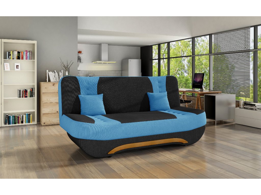 Pohovka EWA II v atraktivní barevné kombinaci Alova 04 (černá) a Alova 29 (modrá) přináší moderní vzhled a praktické funkce, které ocení každý domov. Díky originálnímu tvarování, designovému dřevěnému prvku na spodní části konstrukce a příjemným látkám se stane výrazným a elegantním prvkem vašeho interiéru.