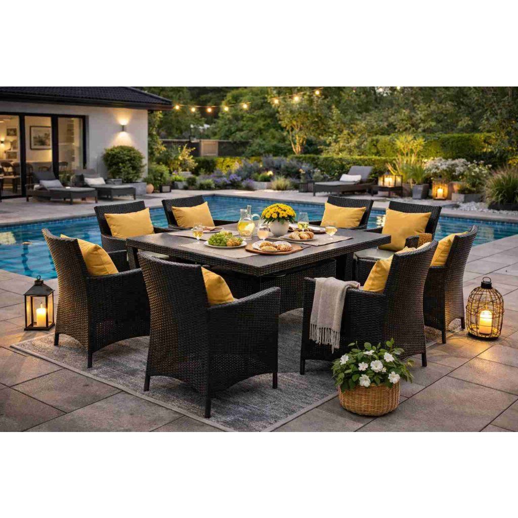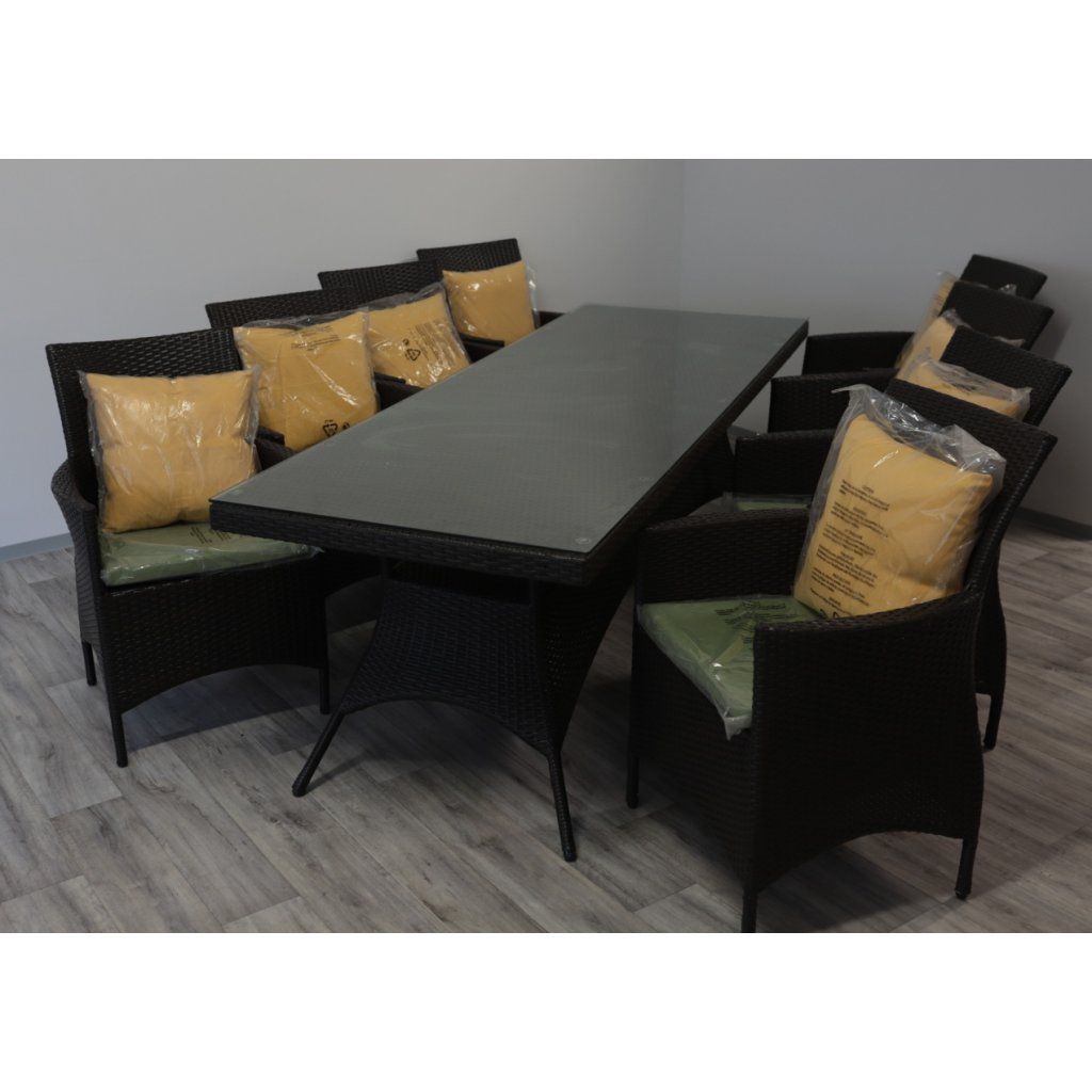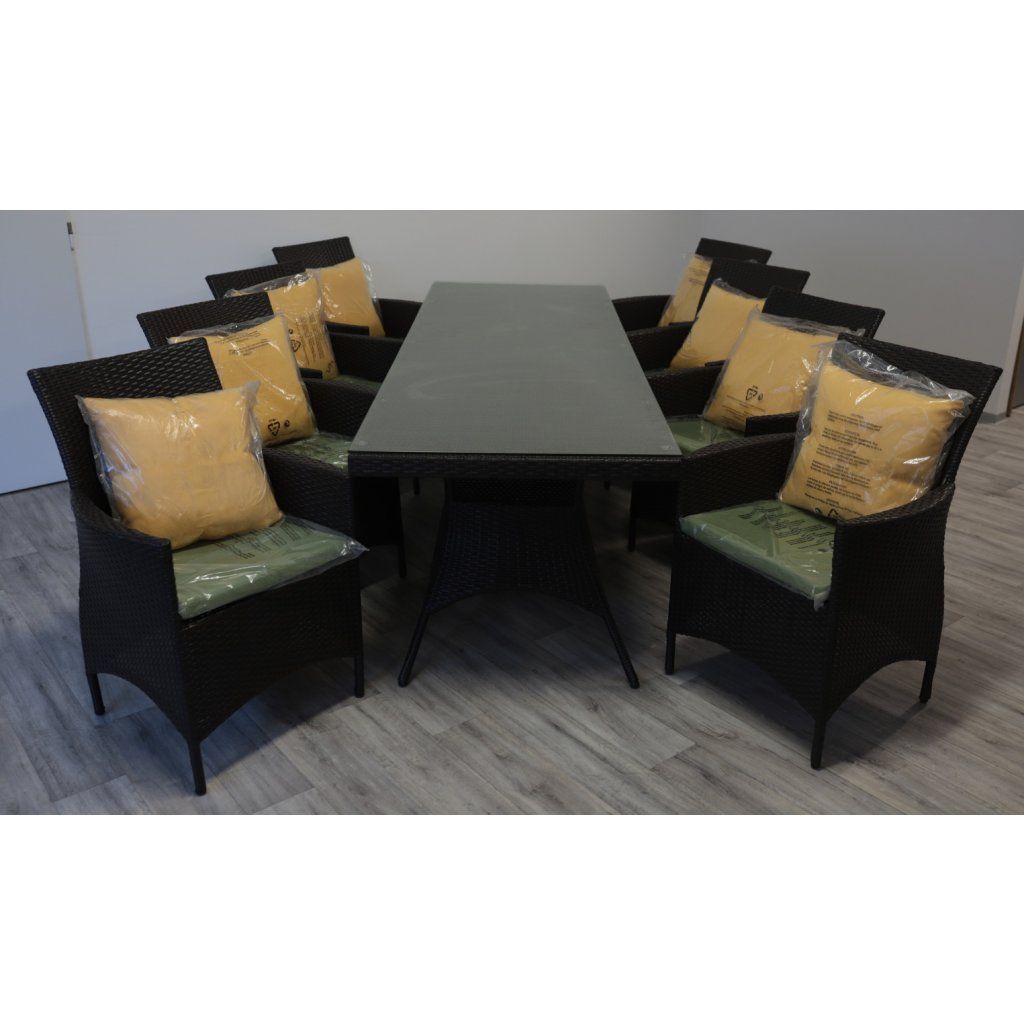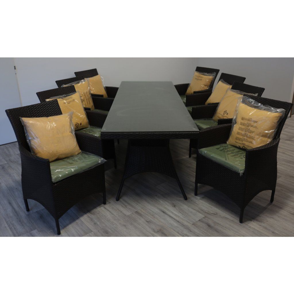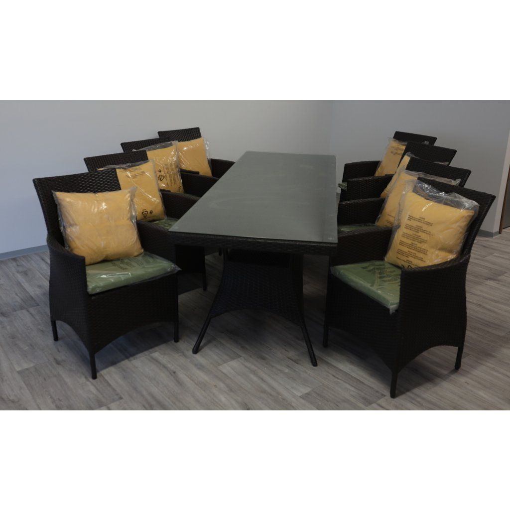 Jídelní ratanová sestava je složená z osmi křesel a jednoho stolu, což poskytuje dostatek místa pro velké rodinné večeře nebo setkání s přáteli. Konstrukce je tvořena hliníkovým a ocelovým rámem s PE ratanem, což zaručuje odolnost a dlouhou životnost. Ideální pro venkovní i vnitřní prostory.