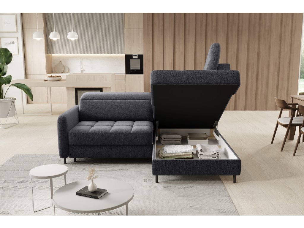 Součástí sedačky je rozkládací mechanismus, který umožňuje snadnou přeměnu na lůžko vhodné pro každodenní relax i spaní hostů. Praktický úložný prostor poskytuje dostatek místa pro povlečení, deky nebo polštáře, čímž pomáhá udržet interiér přehledný a uklizený.