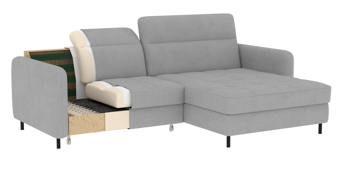 Moderní rohová sedací souprava Gomsi s funkcí spaní nabízí velkorysý prostor, vysoký komfort a elegantní design pro každodenní relax i příležitostné spaní.