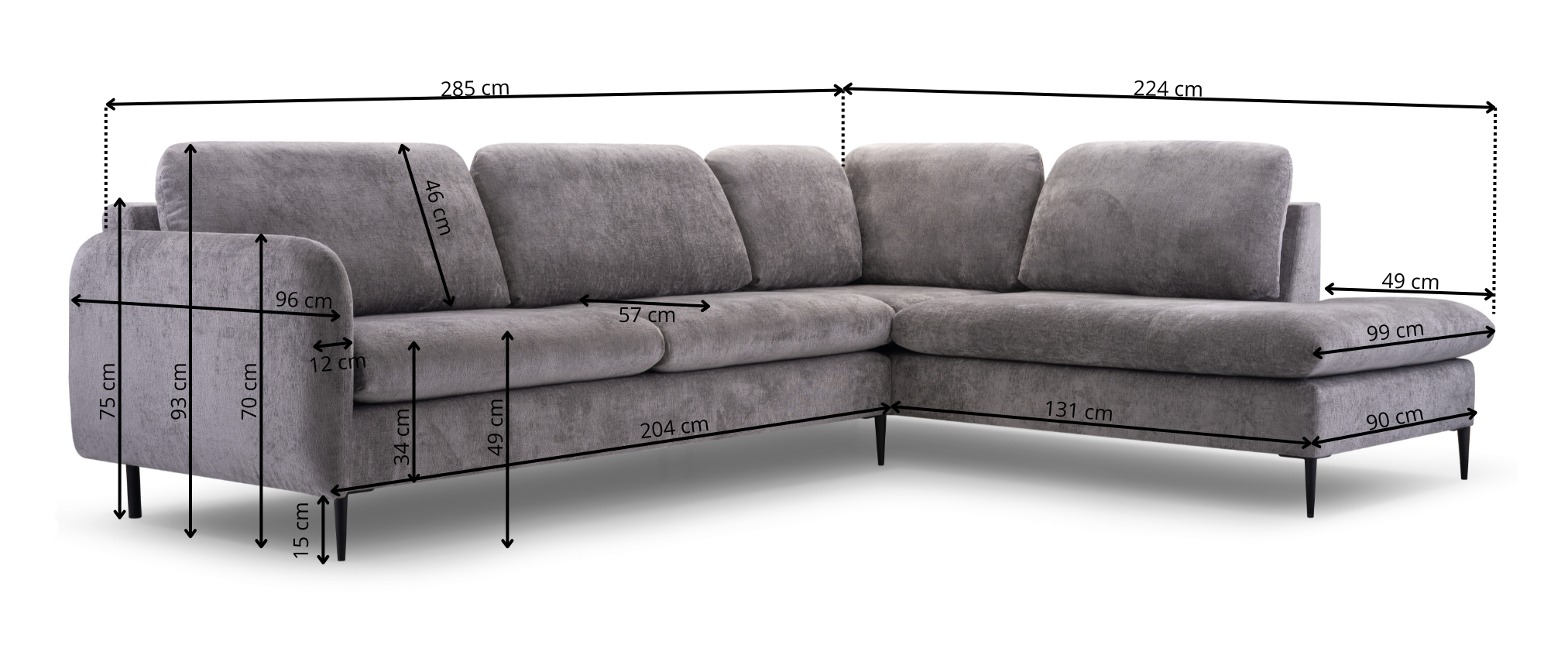 Konstrukci doplňují pevné kovové nohy, které dodávají sedací soupravě lehkost, stabilitu a moderní vzhled. Součástí dodání je nutná montáž.