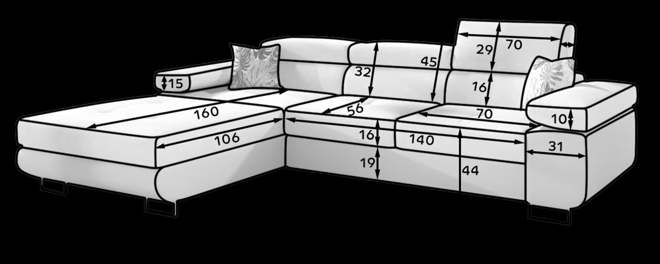 Tato prostorná rohová sedací souprava ve tvaru L kombinuje moderní design s maximálním pohodlím. Sedačka je ideální volbou pro milovníky elegantního nábytku, kteří hledají dokonalý prvek do svého obývacího pokoje. Její jemné prošívání, široké područky a polohovatelné opěrky hlavy zajišťují výjimečný komfort při odpočinku. Chromované kovové nohy s vysokým leskem navíc podtrhují luxusní vzhled tohoto modelu.
