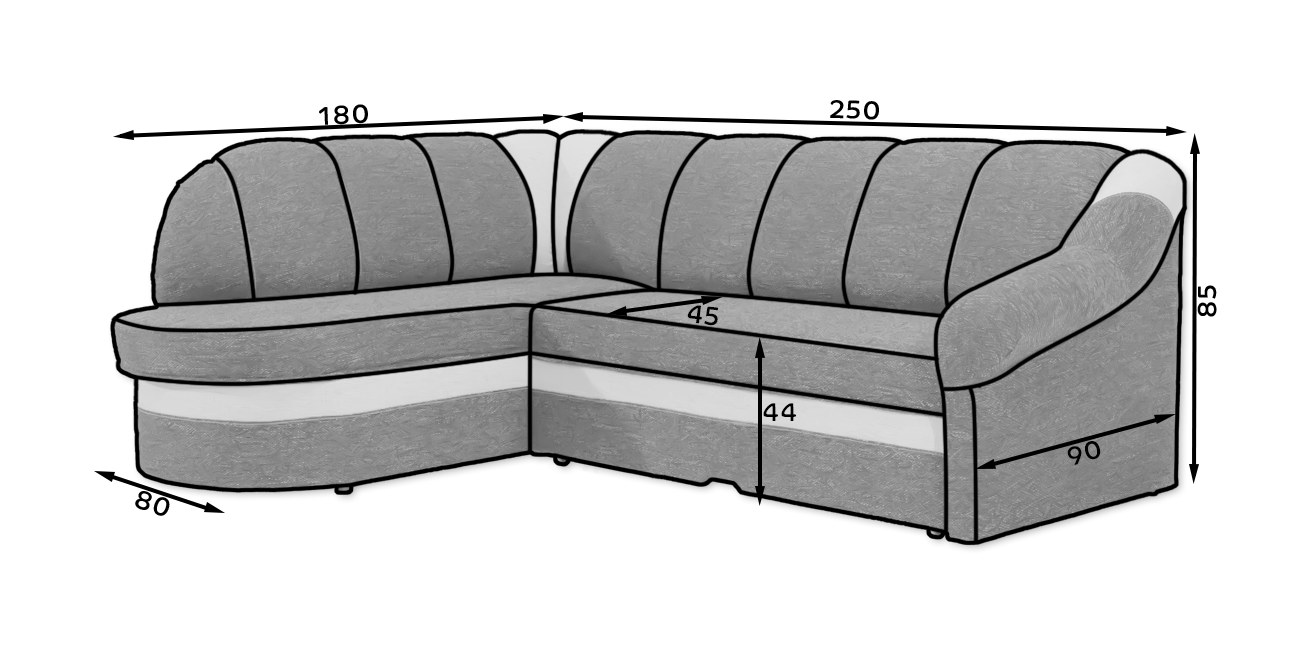 - Celkové rozměry: Šířka 250 cm, hloubka 180 cm, výška 85 cm