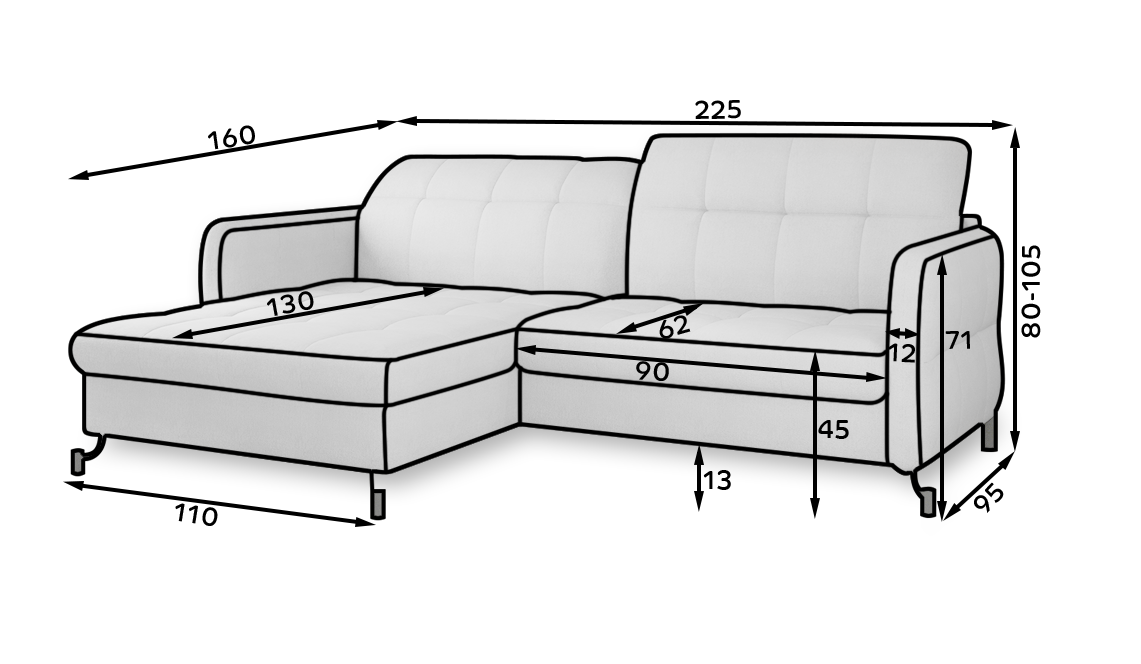Díky rozkládacímu mechanismu lze sedačku jednoduše proměnit v pohodlné lůžko o rozměru 200 × 110 cm, vhodné pro příležitostné spaní. Součástí je také praktický úložný prostor, ideální pro uschování lůžkovin, dek nebo polštářů.