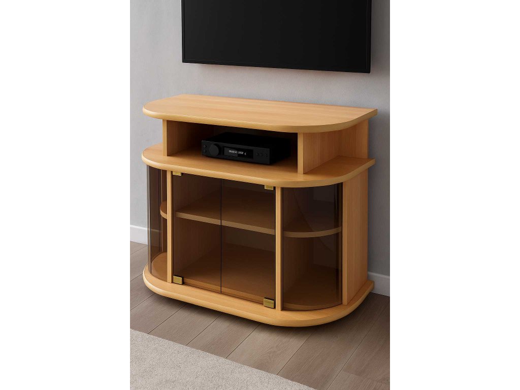 Moderní televizní stolek CROSS v elegantním dekoru buku. Nabízí prostorné police a uzavíratelné skříňky s kouřovým sklem, které dodávají interiéru styl a eleganci. Díky robustní konstrukci je vhodný pro televizi i AV techniku. Rozměr: 94×71×43 cm.