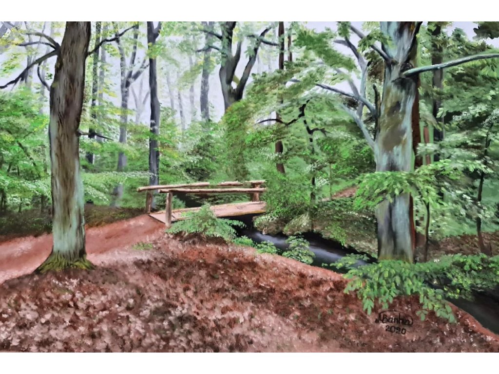 Ručně malovaný obraz na plátně krajina Jarní les, lávka