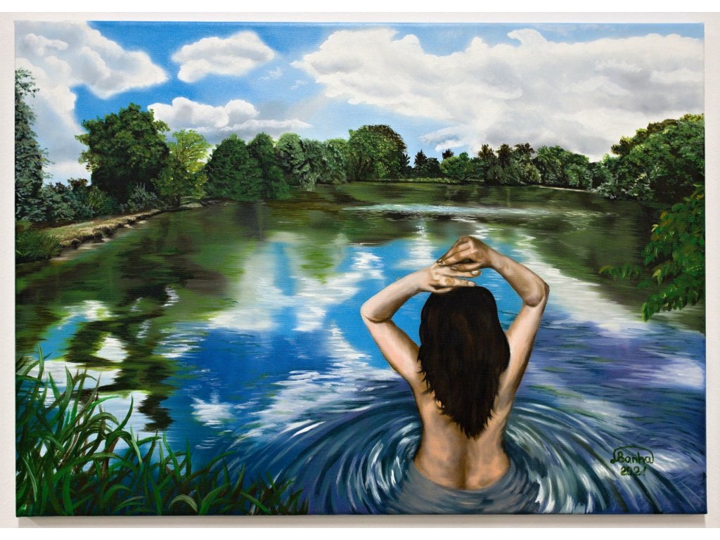 Obraz vás zavede do snového prostředí přírody, kde se žena ponořením do vody stává symbolem krásy, svobody a souladu s okolím.