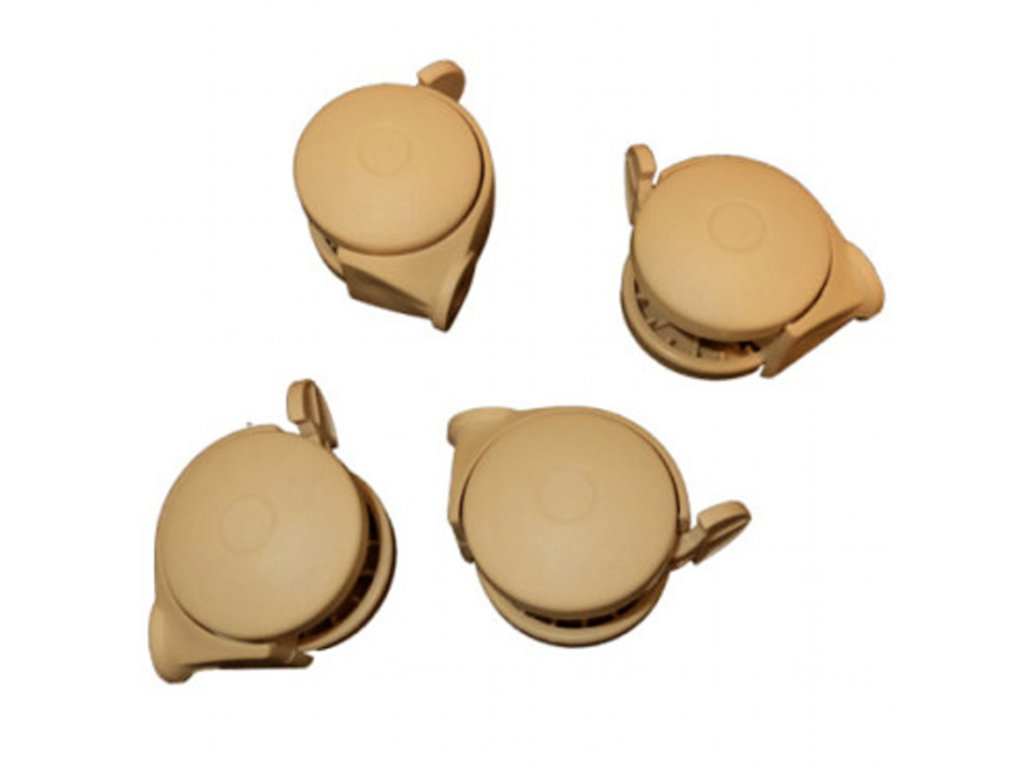 Odolná sada 4 hnědých koleček s čepy vhodná pro dětské postýlky nebo přistýlky. Každé kolečko je vybaveno brzdou pro bezpečné používání. Díky ocelovým čepům je montáž jednoduchá a stabilní.