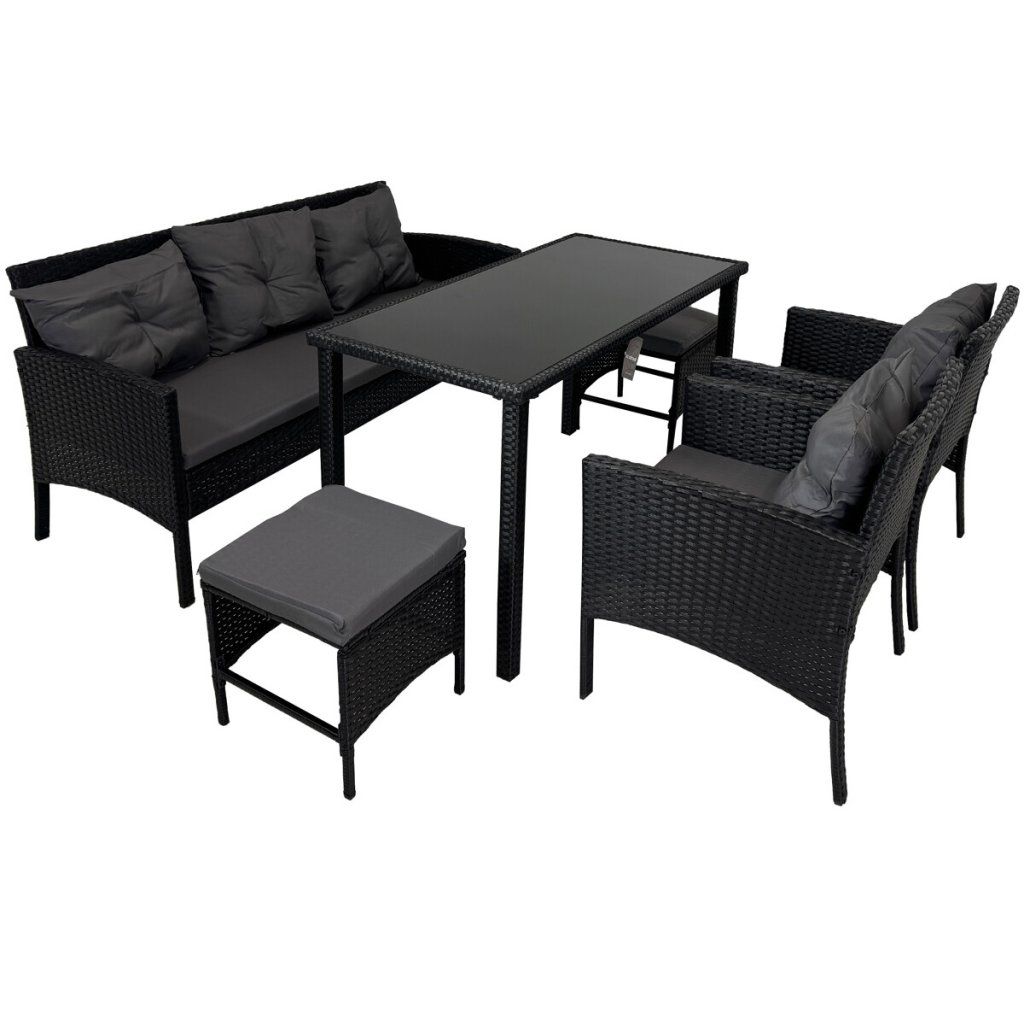 Sada zahradního nábytku Capri PRO pro 6 osob v elegantní černé barvě je ideální volbou pro komfortní venkovní stolování i relaxaci. Set obsahuje prostorný jídelní stůl, dvě pohodlná křesla, lavici pro více osob a praktický taburet.