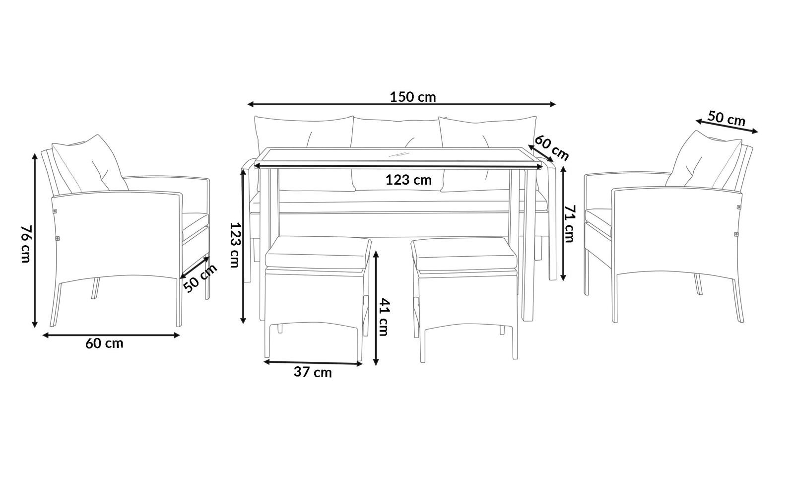 Konstrukce je vyrobena z pevného kovu a kvalitního technorattanu, který je vysoce odolný vůči povětrnostním vlivům, UV záření i běžnému opotřebení. Stůl je doplněn pevnou deskou, která poskytuje stabilní prostor pro stolování. Měkké polstry zajišťují maximální komfort při sezení.
