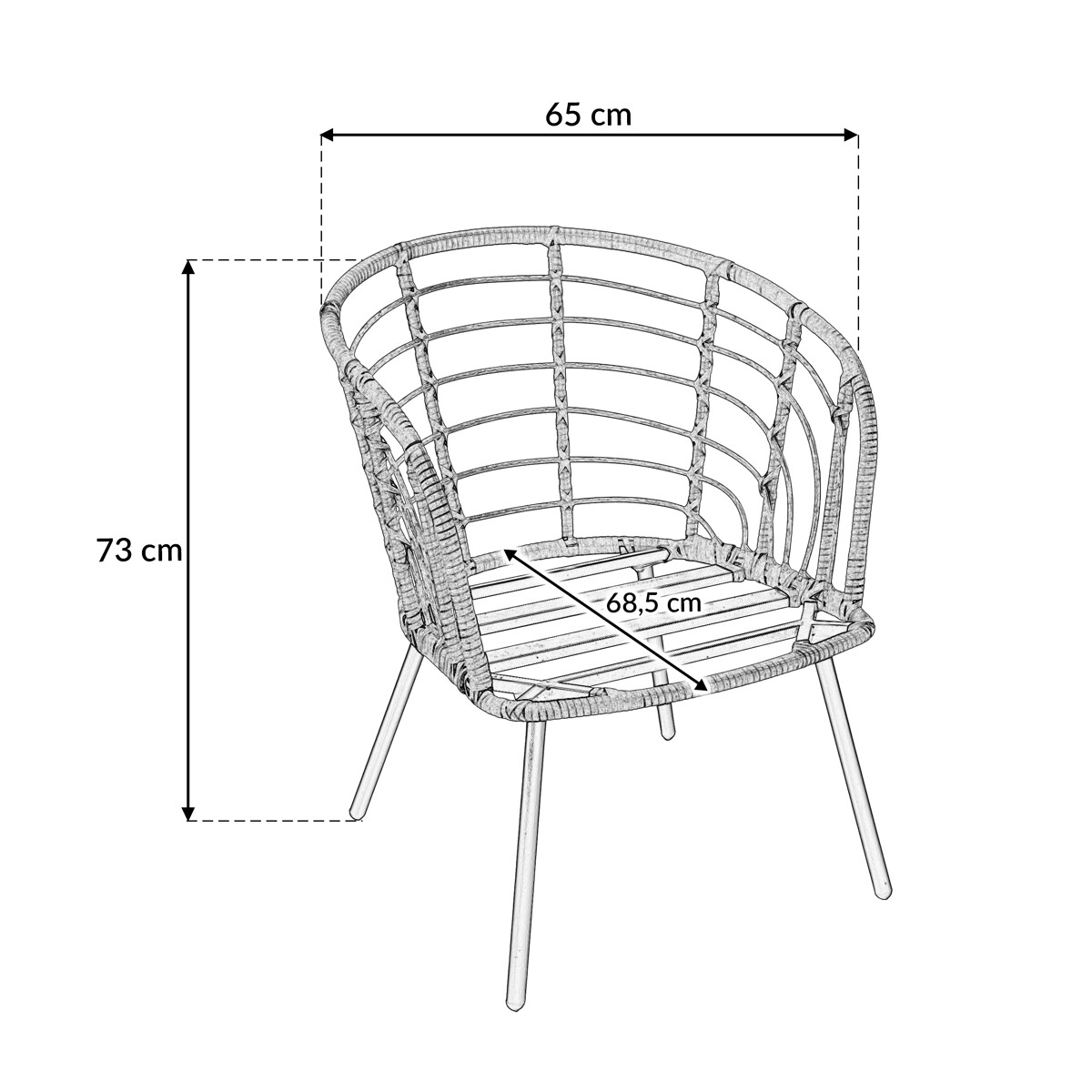 Křesla jsou vybavena kvalitním výpletem v přírodním ratanovém vzhledu, který v kombinaci s pevnou kovovou konstrukcí zajišťuje vysokou odolnost a stabilitu. Pohodlné sedáky a opěrné polštáře poskytují maximální komfort při relaxaci.
