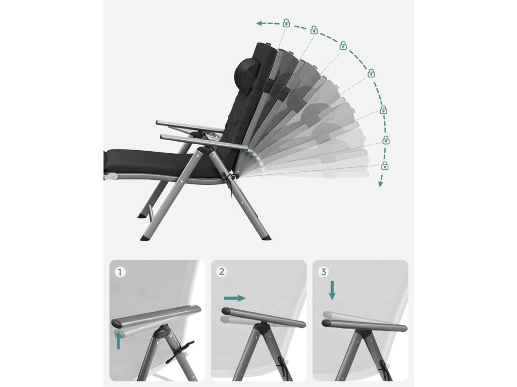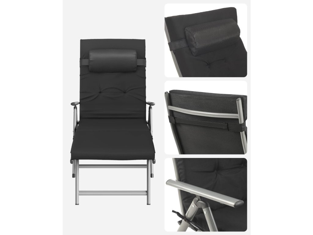 Lehátko je vybaveno polohovatelným opěradlem, které umožňuje nastavení ideální polohy pro čtení, opalování i krátký odpočinek. Součástí je také odnímatelný polštářek pro lepší oporu hlavy a krční páteře.