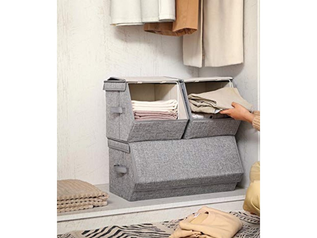 Boxy jsou stohovatelné a po složení nezabírají téměř žádné místo – ideální i do menších bytů. Praktická madla po stranách usnadňují manipulaci.