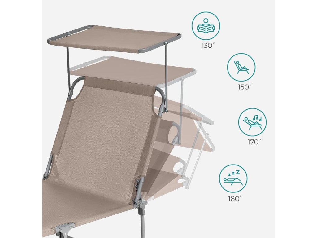 Lehátko disponuje polohovatelným opěradlem, které umožňuje nastavení komfortní polohy pro čtení, opalování nebo krátký odpočinek. Velkou výhodou je nastavitelná stříška, která poskytuje ochranu hlavy a obličeje před přímým sluncem. Součástí je také měkký polštářek pro větší pohodlí v oblasti krku.