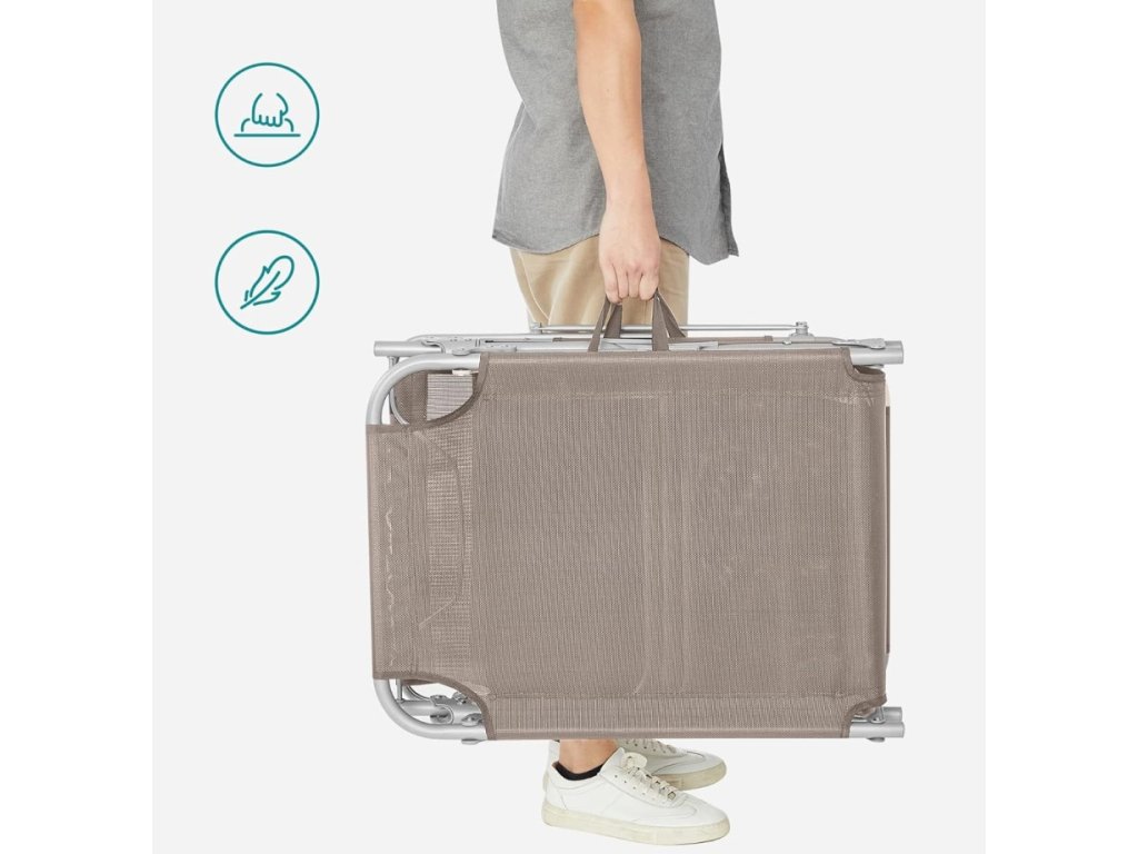 Stabilní kovová konstrukce zajišťuje pevnost a dlouhou životnost, zatímco prodyšná textilní plocha je příjemná i při vyšších teplotách. Díky skládacímu mechanismu lze lehátko snadno přenášet a skladovat, což oceníte zejména při sezónním používání nebo na menších balkonech.