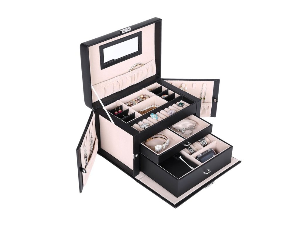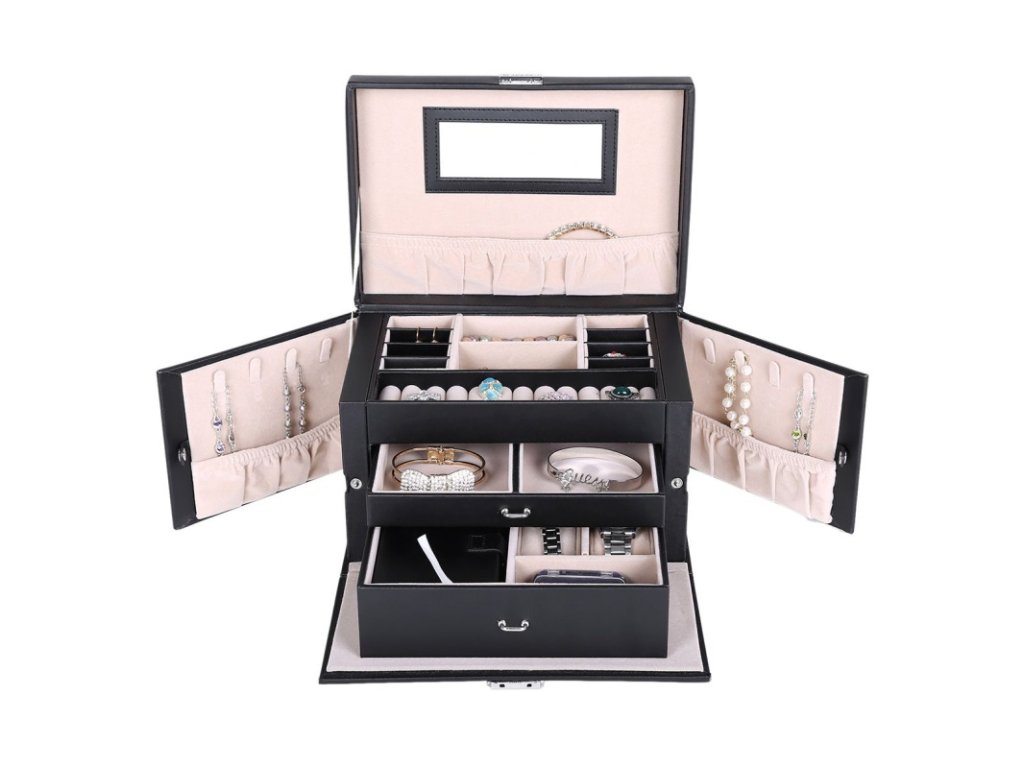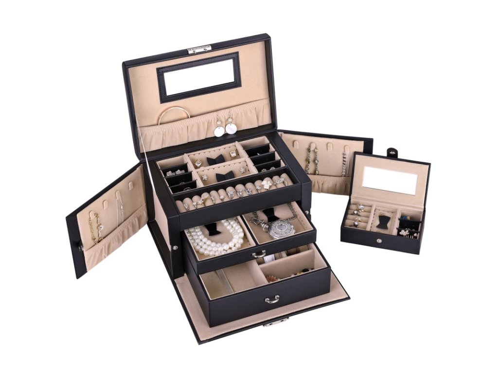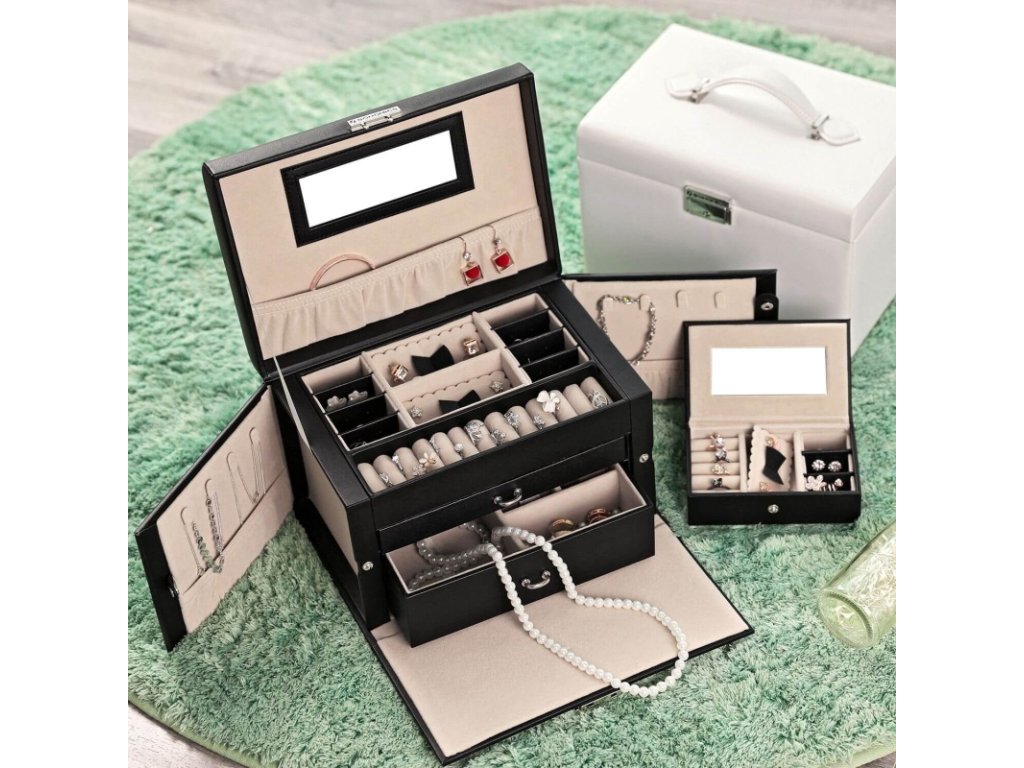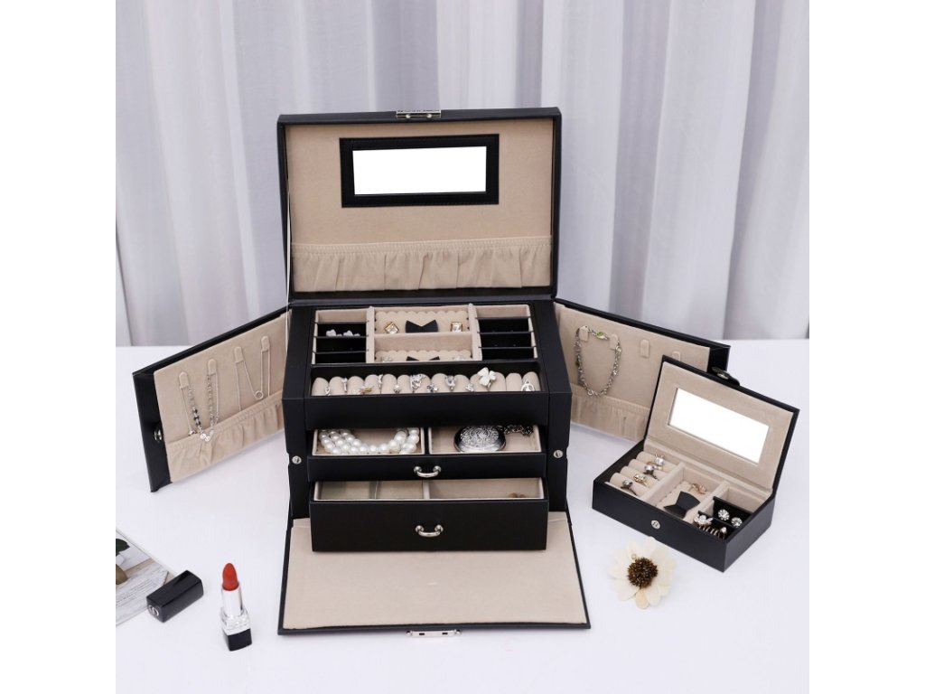 Šperkovnice se 2 zásuvkami – černá elegantní šperkovnice se zrcadlem
