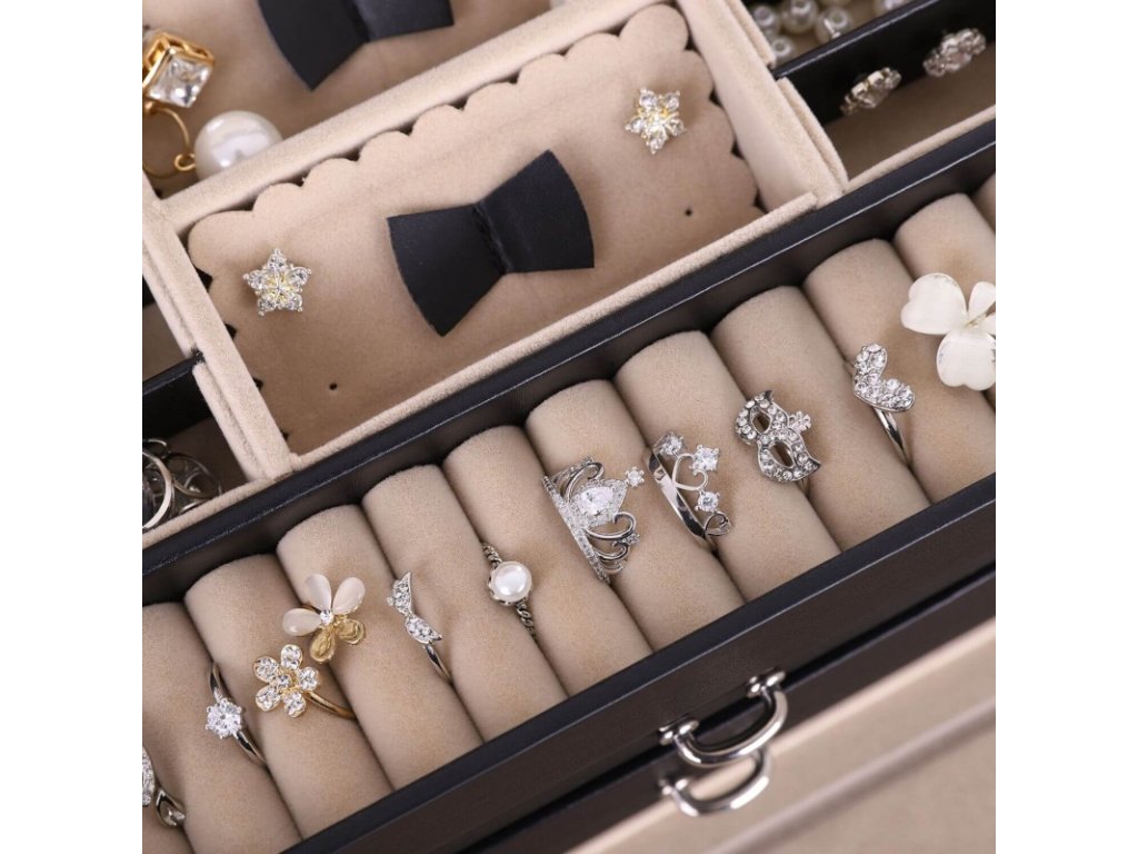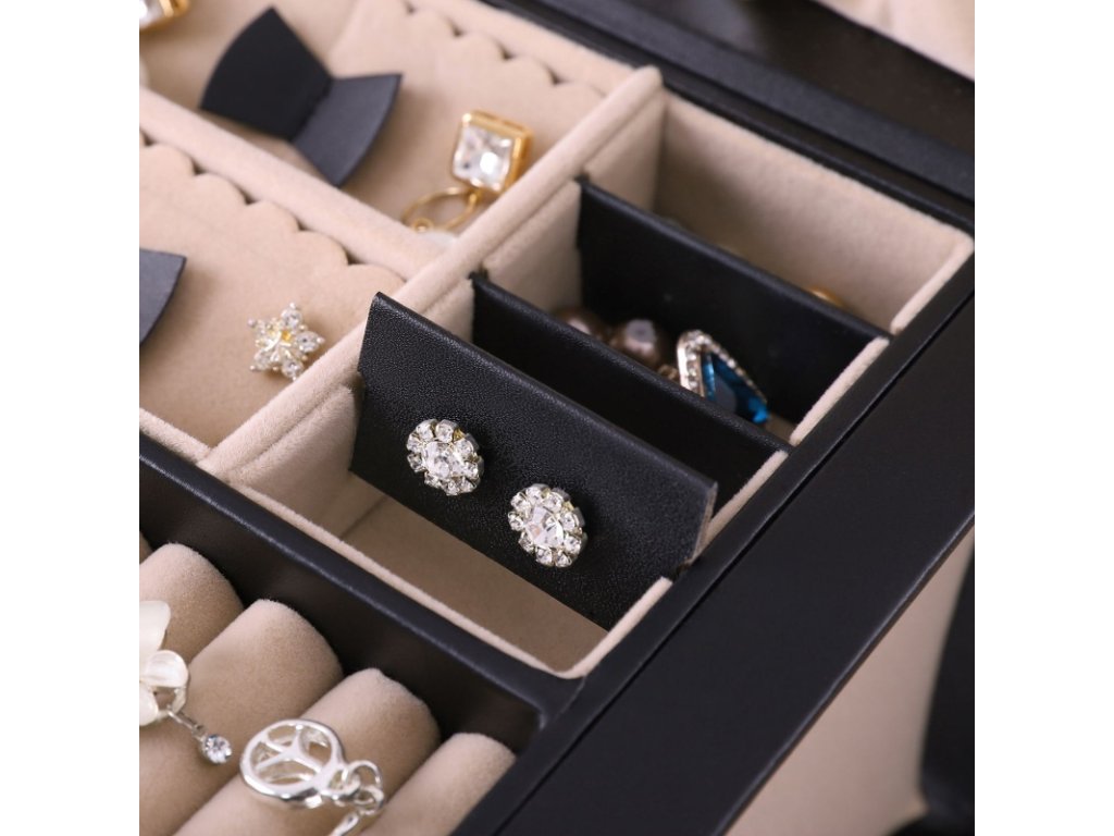Vnitřní prostor je bohatě členěný – nabízí oddělené přihrádky na prsteny, náušnice, náramky, řetízky i hodinky. Horní část je vybavena integrovaným zrcadlem, praktickými kapsami a háčky na řetízky, které zabraňují jejich zamotání.