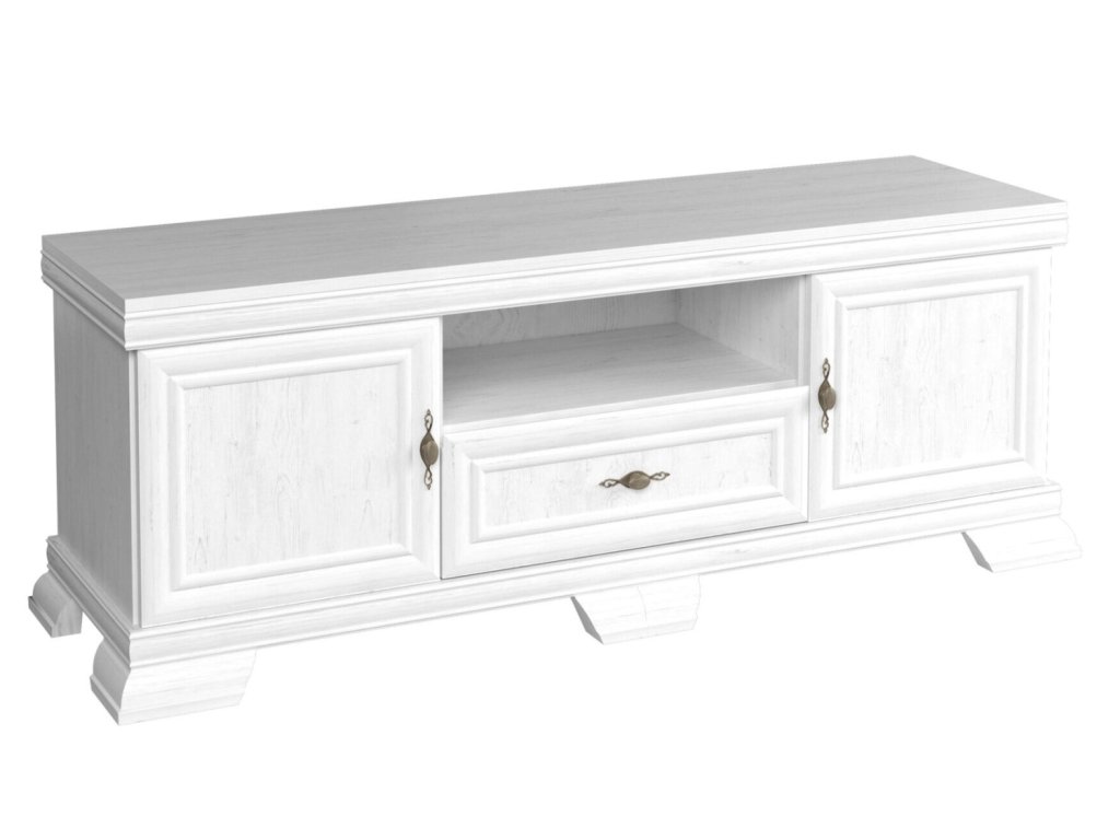 Stylový televizní stolek Kora KRT2 je ideálním doplňkem každého obývacího pokoje v klasickém či rustikálním stylu. Nabízí dvě prostorné skříňky, středový otevřený prostor pro AV techniku a praktickou zásuvku pro uložení drobností. Masivní sokl a dekor dřeva dodávají stolku elegantní vzhled a nadčasový design, který snadno sladíte s dalším nábytkem kolekce Kora. Vyroben z kvalitní LDTD, zaručuje dlouhou životnost a snadnou údržbu.