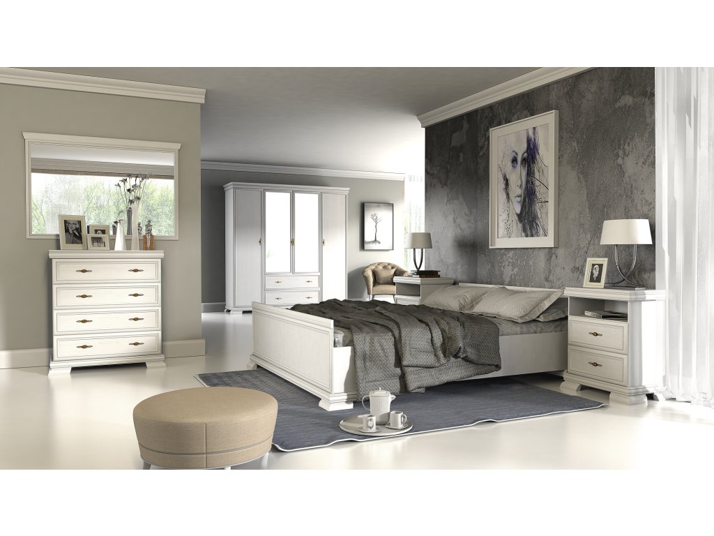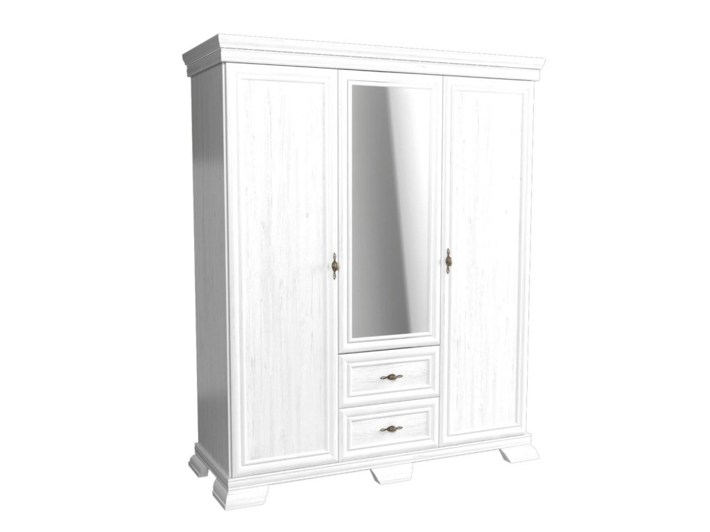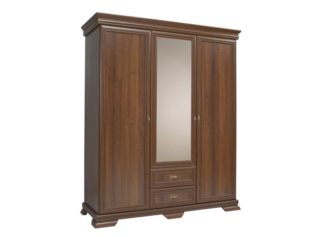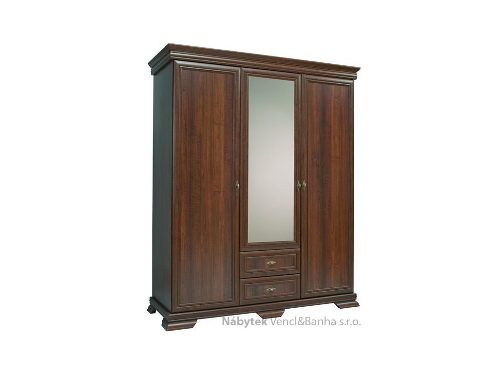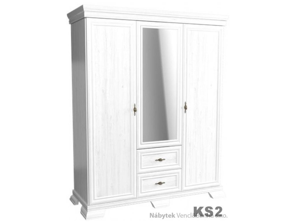 Klasická šatní skříň KS2 z kolekce KORA přináší do vašeho interiéru nádech elegance a nadčasovosti. Vyznačuje se masivní konstrukcí, stylizovanými nožkami a dekorativními kovovými úchyty. Skříň je vyrobena z kvalitní nábytkové desky dýhované fólií, což zajišťuje snadnou údržbu a dlouhou životnost. Skříň disponuje třemi dveřmi, z nichž prostřední část je osazena praktickým zrcadlem. Dvě prostorné zásuvky ve spodní části umožňují uložení drobnějších předmětů nebo textilií. Díky kombinaci funkčnosti a stylového provedení je ideální volbou do ložnic, předsíní i šaten.