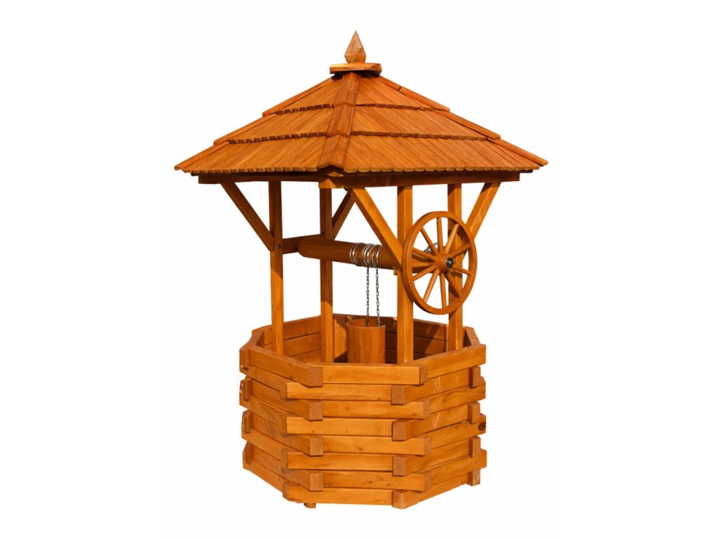Dekorační dřevěná zahradní studna o průměru 105 cm z masivního jehličnatého dřeva s impregnací. Snadná montáž, doprava po celé ČR.
