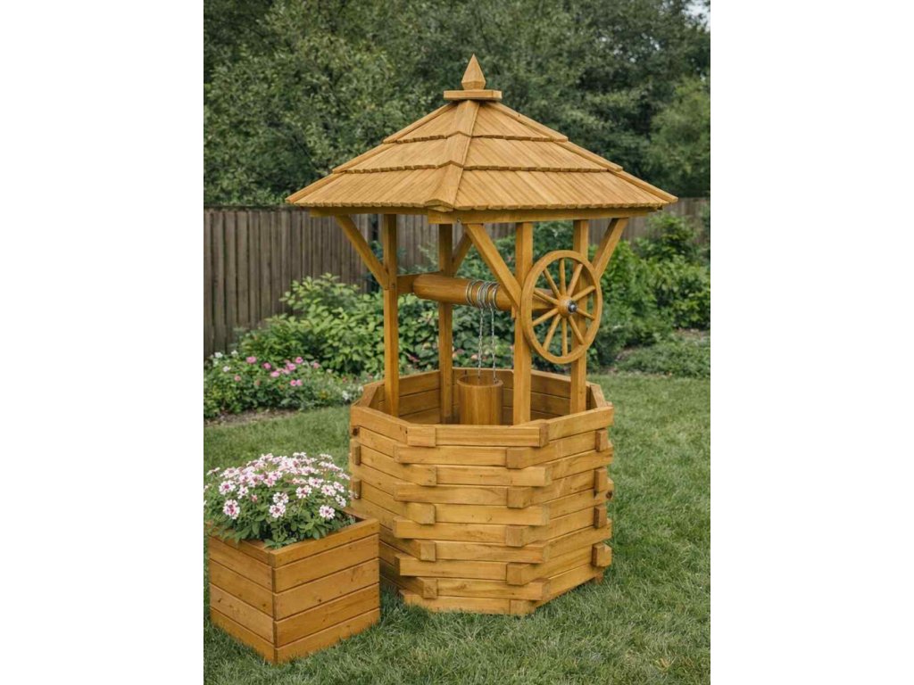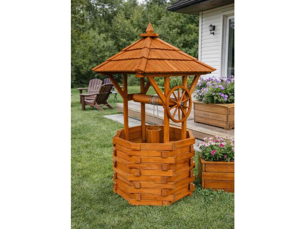 Velká dřevěná zahradní studna WERA o průměru 120 cm je výrazná rustikální dekorace z masivu vhodná jako okrasný i květinový prvek. Tato dřevěná zahradní dekorační studna je skvělým doplňkem pro vaši zahradu. Je ideální pro aranžování květin a jako stylový dekorativní prvek, který přidá kouzlo vašemu exteriéru.